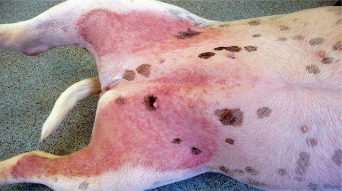 - гиперемения (покраснение) кожи (чаще поражается кожа наружного слухового прохода, кожа мошонки, межпальцевые пространства);