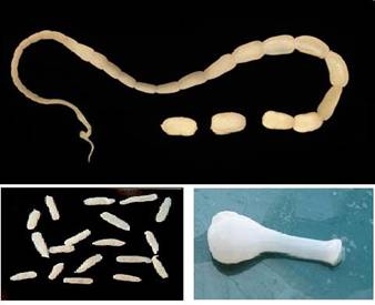 Цепень использует ротовые части как крючок для крепления к стенке тонкой кишки. Взрослые черви могут достигать в длину несколько сантиметров.