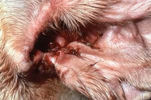 При малассезиозном дерматите кожа воспаляется, становится красной, затем утолщается и темнеет. Возникает зуд. Чаще всего поражаются подмышечные области, пах, межпальцевое пространство, когтевой валик и коготь (при этом основание когтя меняет цвет и становится коричневым).