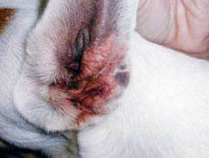 Для малассезиозного отита характерен сильный зуд. Собака трясет головой, чешет уши, кожа наружного слухового прохода покрасневшая и утолщенная. Выделения из ушей