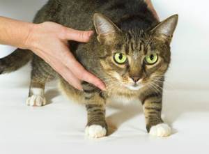 - кошка может отказываться ложиться, сидит в характерной позе с выворачиванием локтей наружу.