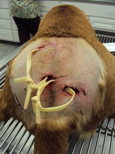 Тактика лечения зависит от степени повреждения, общего состояния пациента. Так, если собака хорошо себя чувствует, активна – проводится санация пораженной области, назначается антибиотикотерапия.