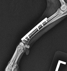Использование гипсовых повязок у животных часто приводит к невозможности использовать конечность и нарушению трофики, в то время как оперативное лечение максимально уменьшает сроки реабилитации и позволяет обеспечить опороспособность на прооперированую конечность уже в раннем послеоперационном периоде.
