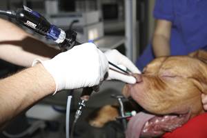 На приеме врач внимательно осматривает пациента, проводит сбор анамнеза. Если присутствовал эпизод травмы – владелец должен сообщить об этом врачу. Ротовая полость собаки обследуется на предмет выявления больных зубов, сильного воспаления десен. При поражении корня зуба, формировании абсцесса может возникнуть нозооральная фистула (патологический канал между носовой и ротовой полостью). При необходимости делается рентгенограмма челюсти, которая позволяет выявить скрытые проблемы.