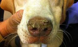 Если общее состояние собаки остается удовлетворительным, а ее нос – сухой и покрывается трещинками и струпьями, покажите питомца ветеринарному дерматологу: так могут проявляться различные кожные болезни, начиная от аллергии и заканчивая пузырчаткой. Гиперкератоз (сухая шелушайщаяся ороговевшая мочка носа) может встречаться при ряде заболеваний, таких как чума плотоядных, цинк-зависимый дерматоз.
