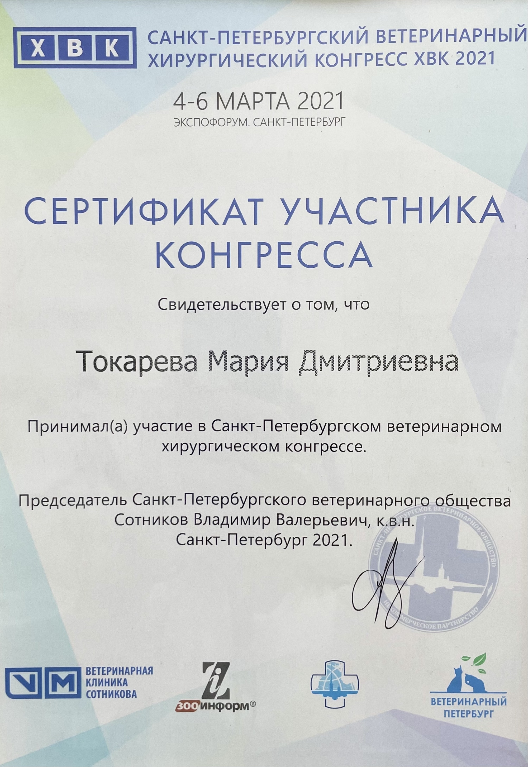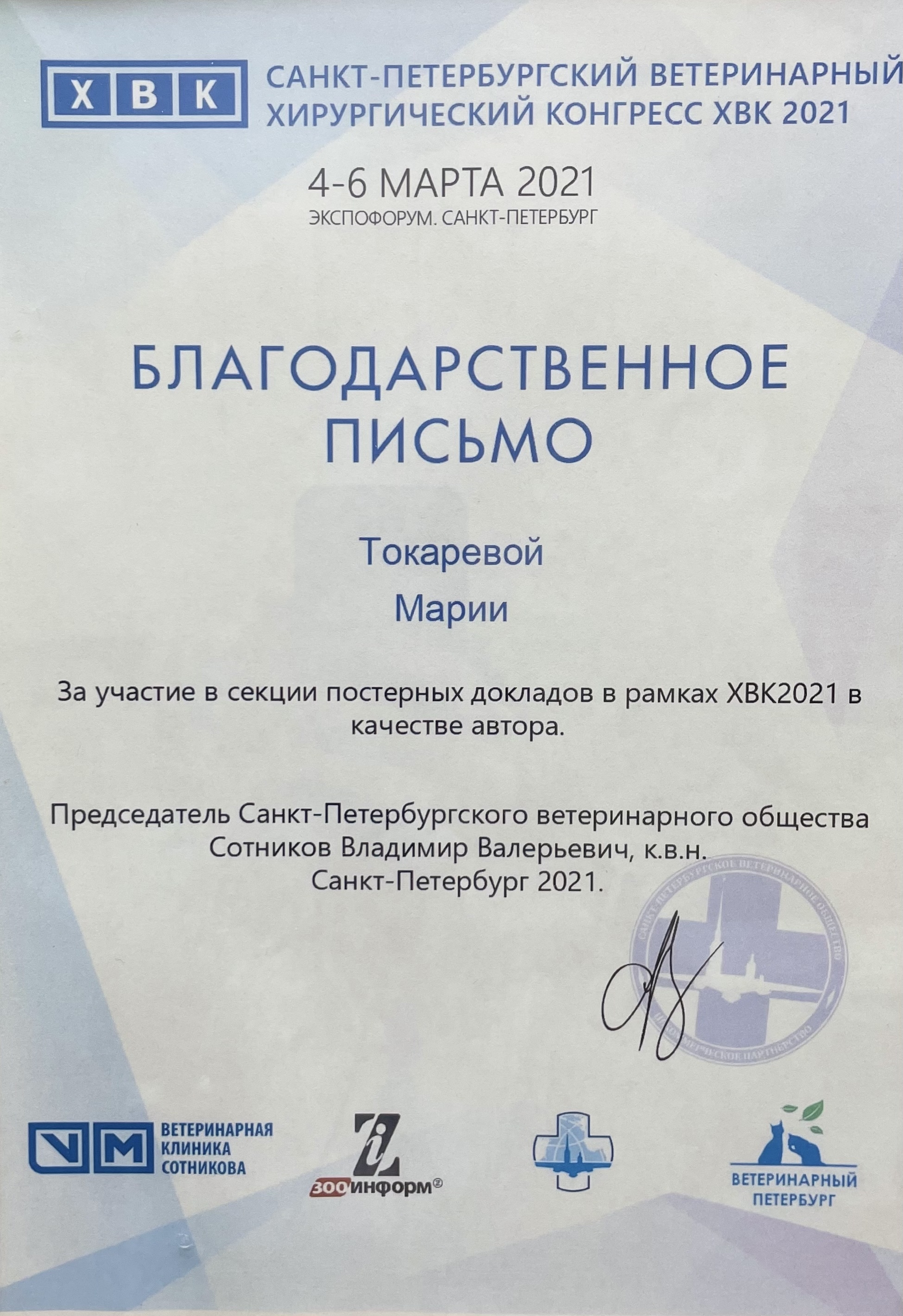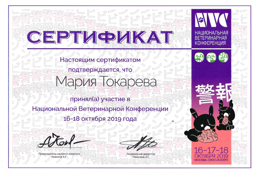 С 2017 года – ежегодный участник крупнейших конференций, таких как «Национальная ветеринарная конференция» (NVC) и «Санкт-Петербургская хирургическая ветеринарная конференция» (ХВК).
