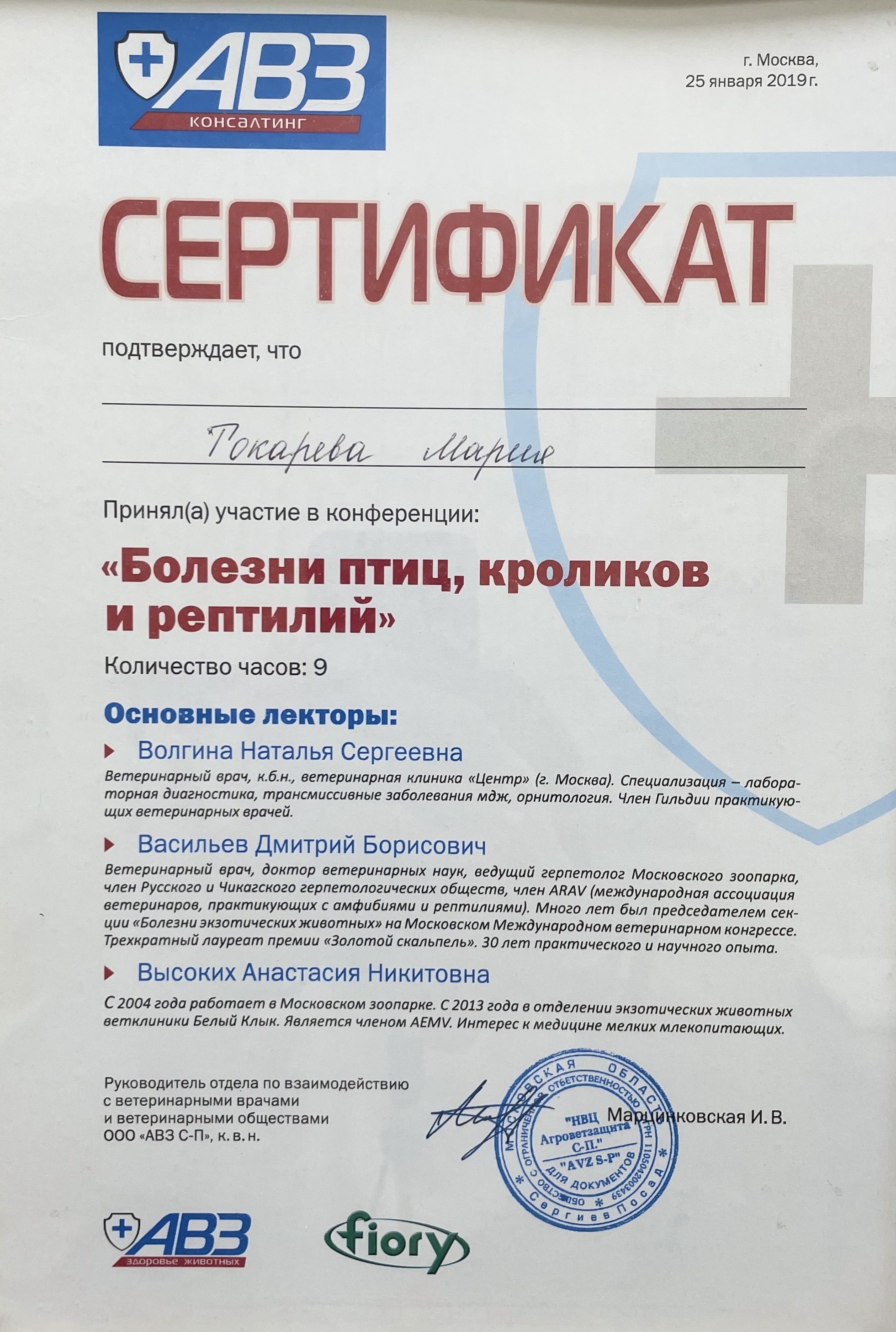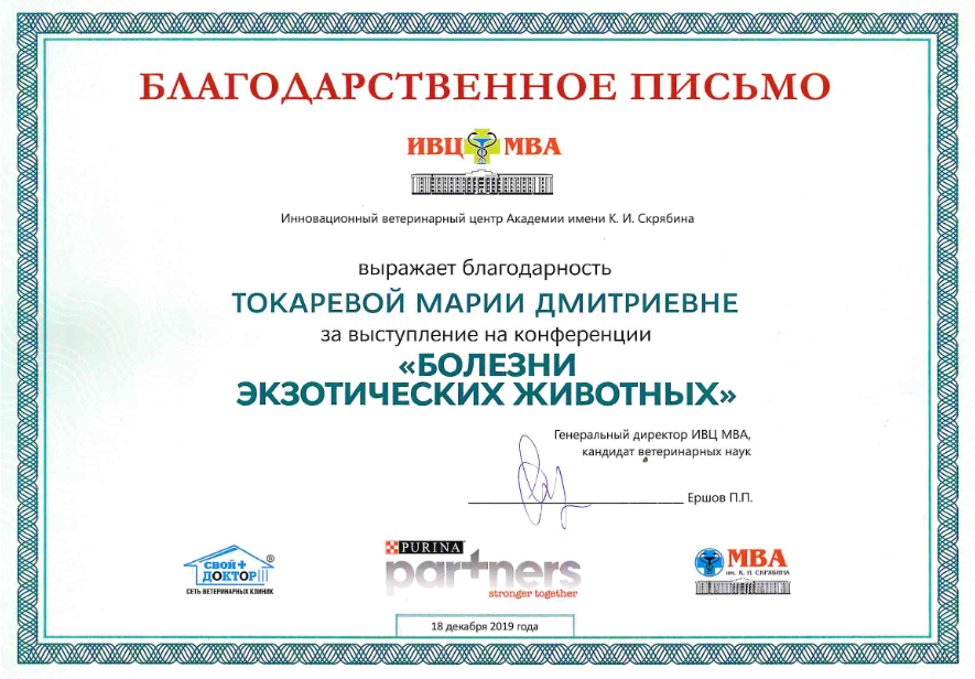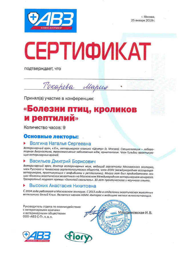 2019 год – участие в конференции «Болезни птиц, кроликов и рептилий» от компании АЗС.