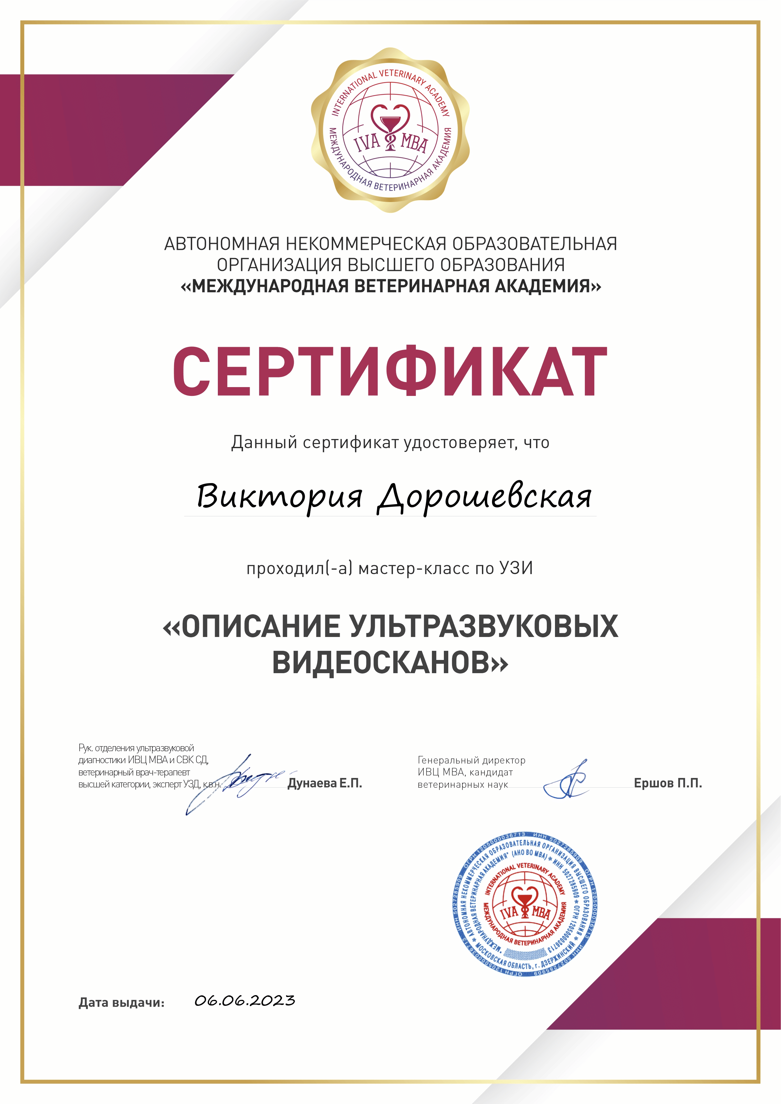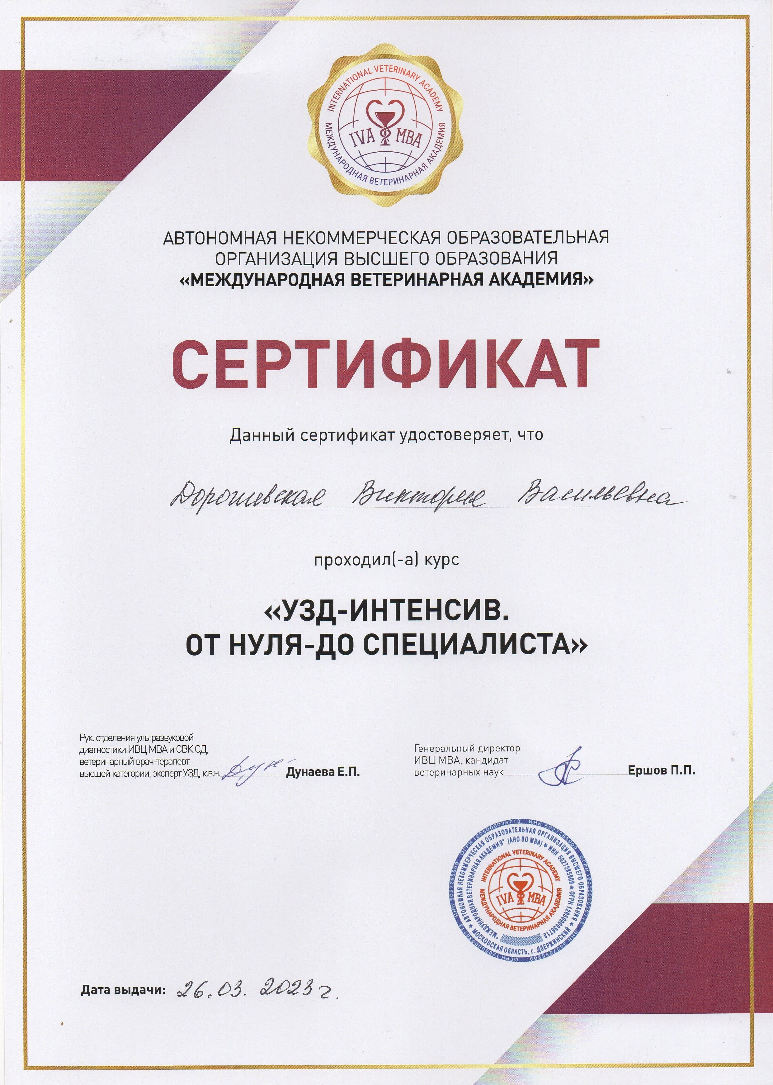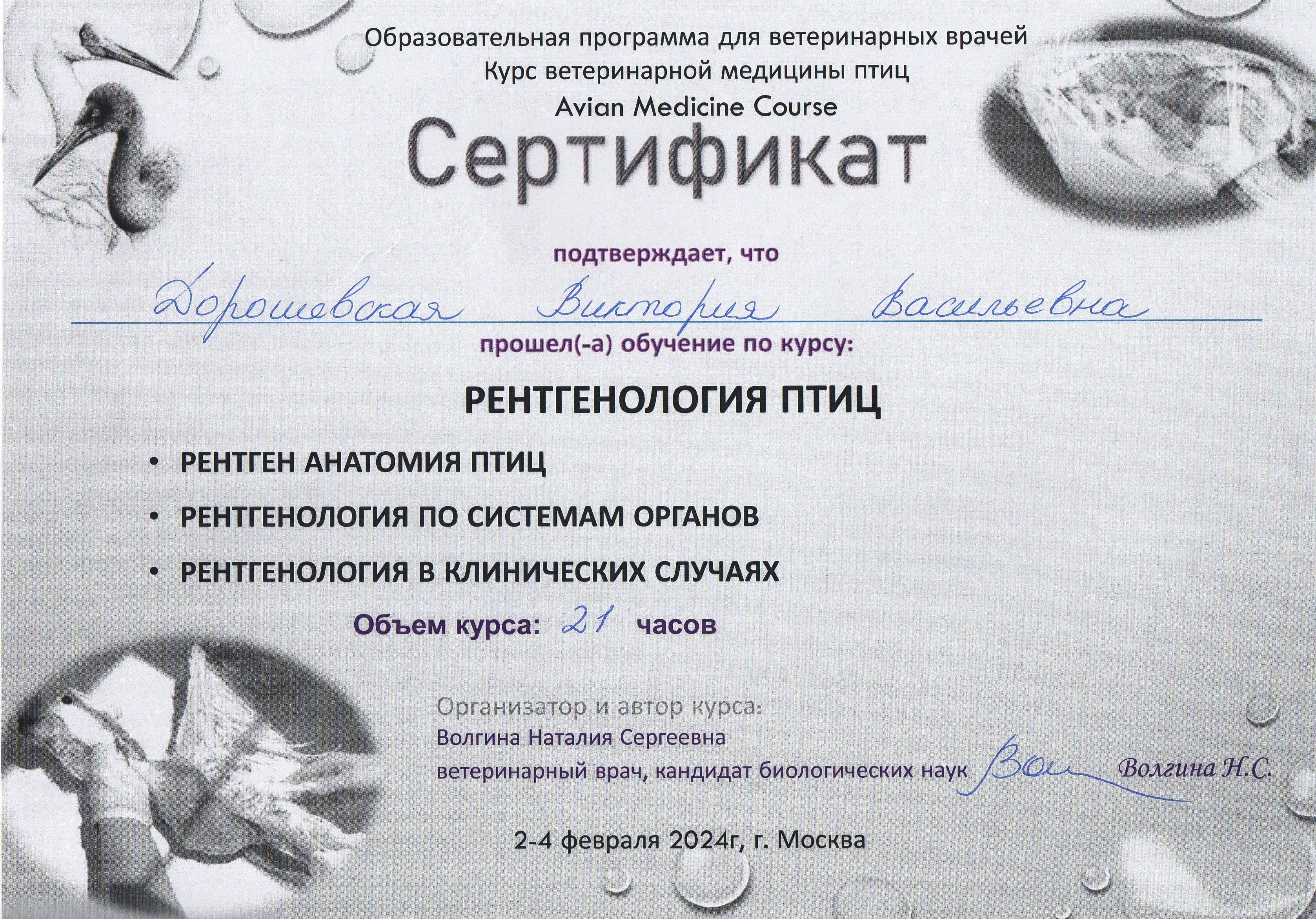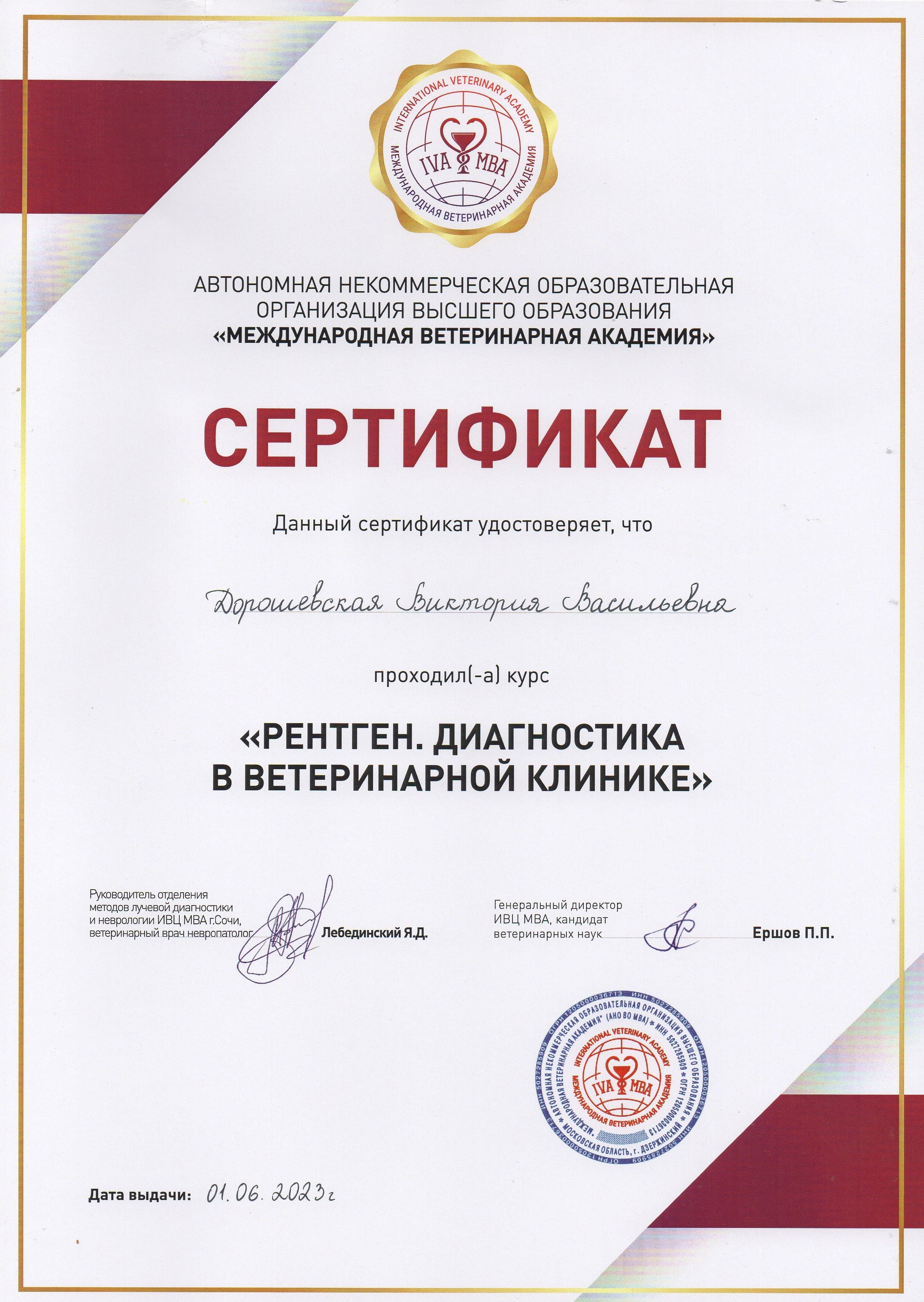 2023 год – курс повышения квалификации «Рентген. Диагностика в ветеринарной клинике» под руководством Лебединского Ярослава Демидовича.
