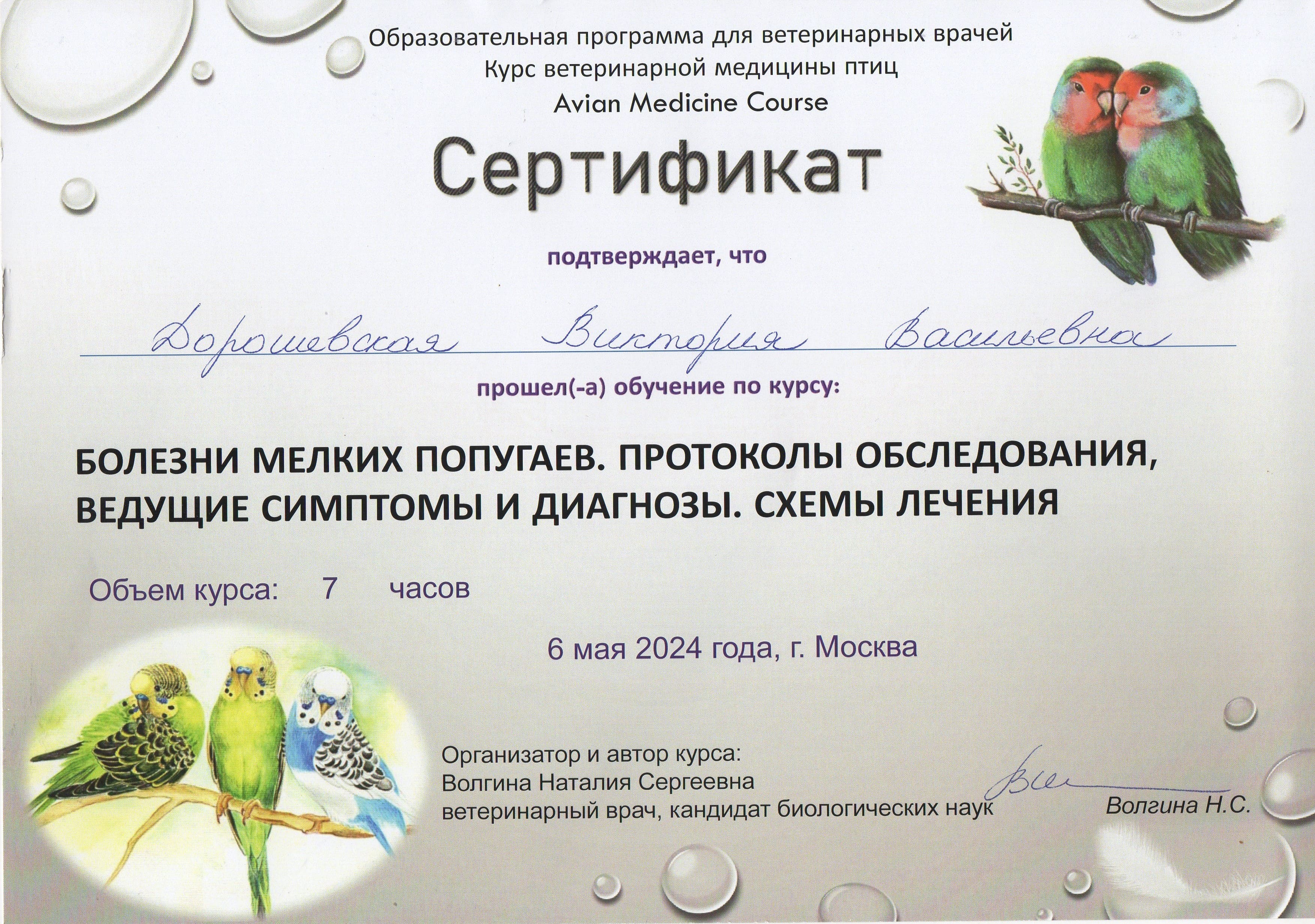 2024 год – образовательная программа для ветеринарных врачей, ветеринарная медицина птиц, курс: «Болезни мелких попугаев» под руководством Волгиной Наталии Сергеевны.