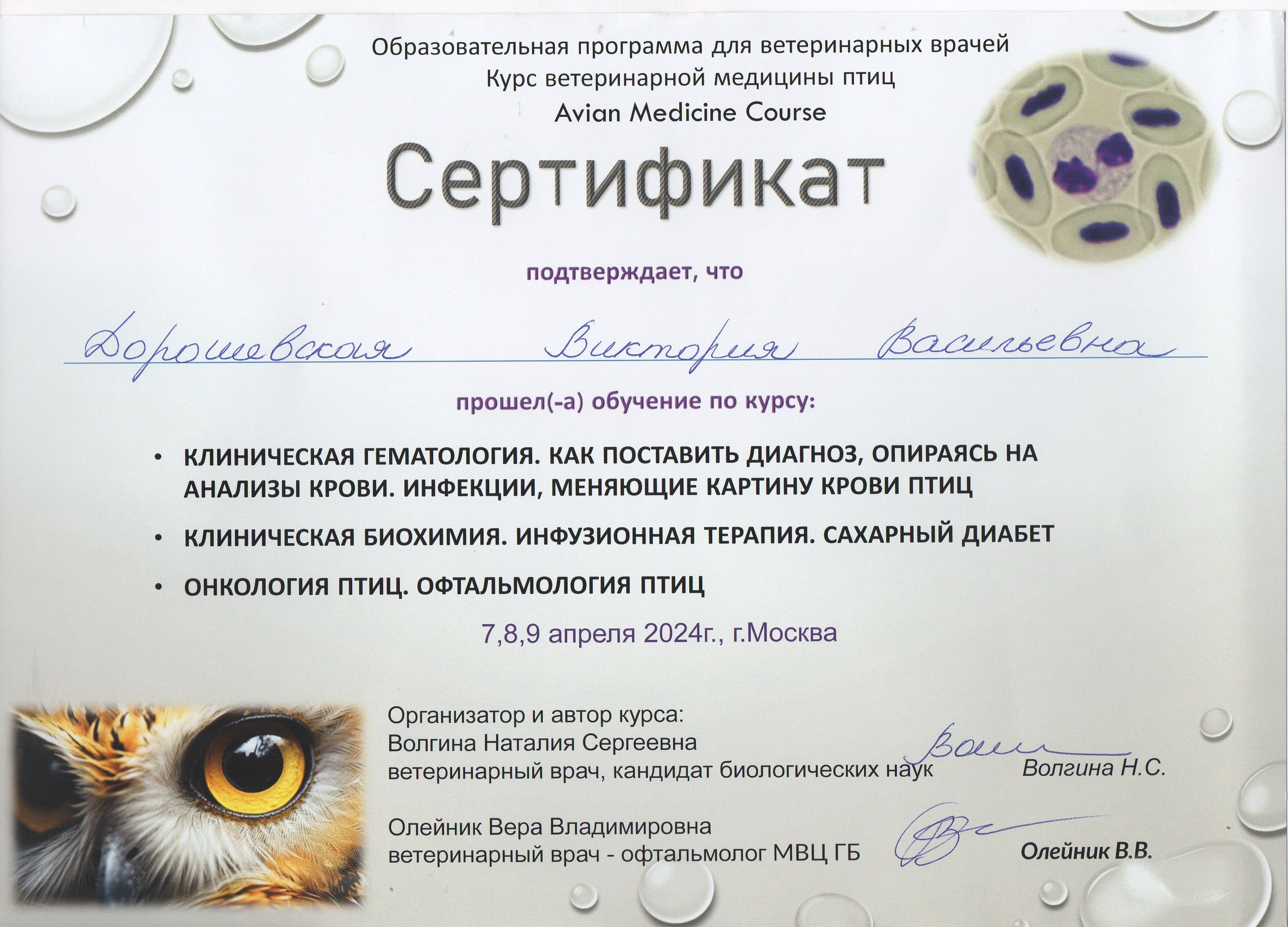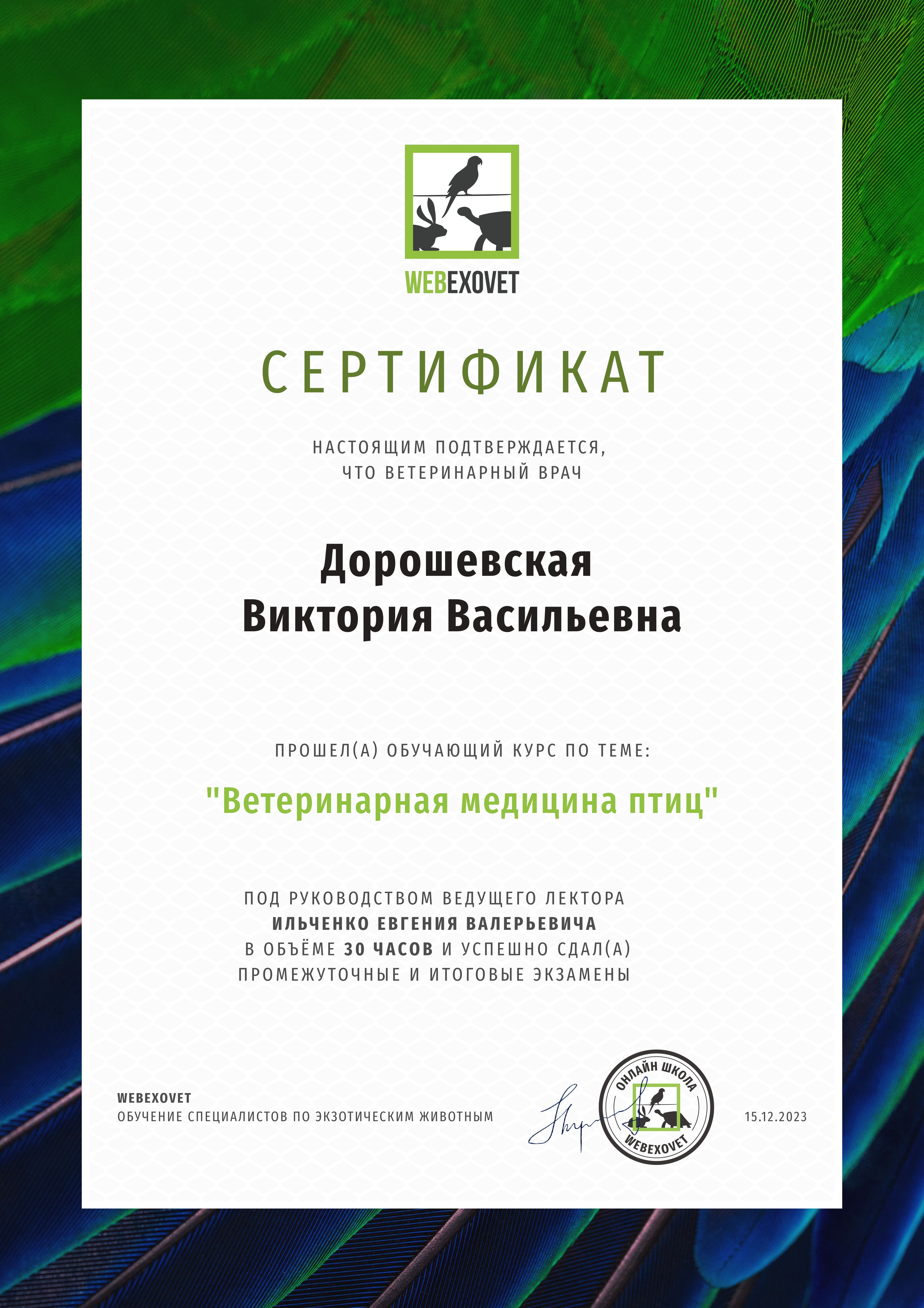 2023 год – прошла обучающий курс от «WEBEXOVET» по теме «Ветеринарная медицина птиц» под руководством ведущего лектора Ильченко Евгения Валерьевича в объеме 30 часов и успешно сдала промежуточные и итоговые экзамены.