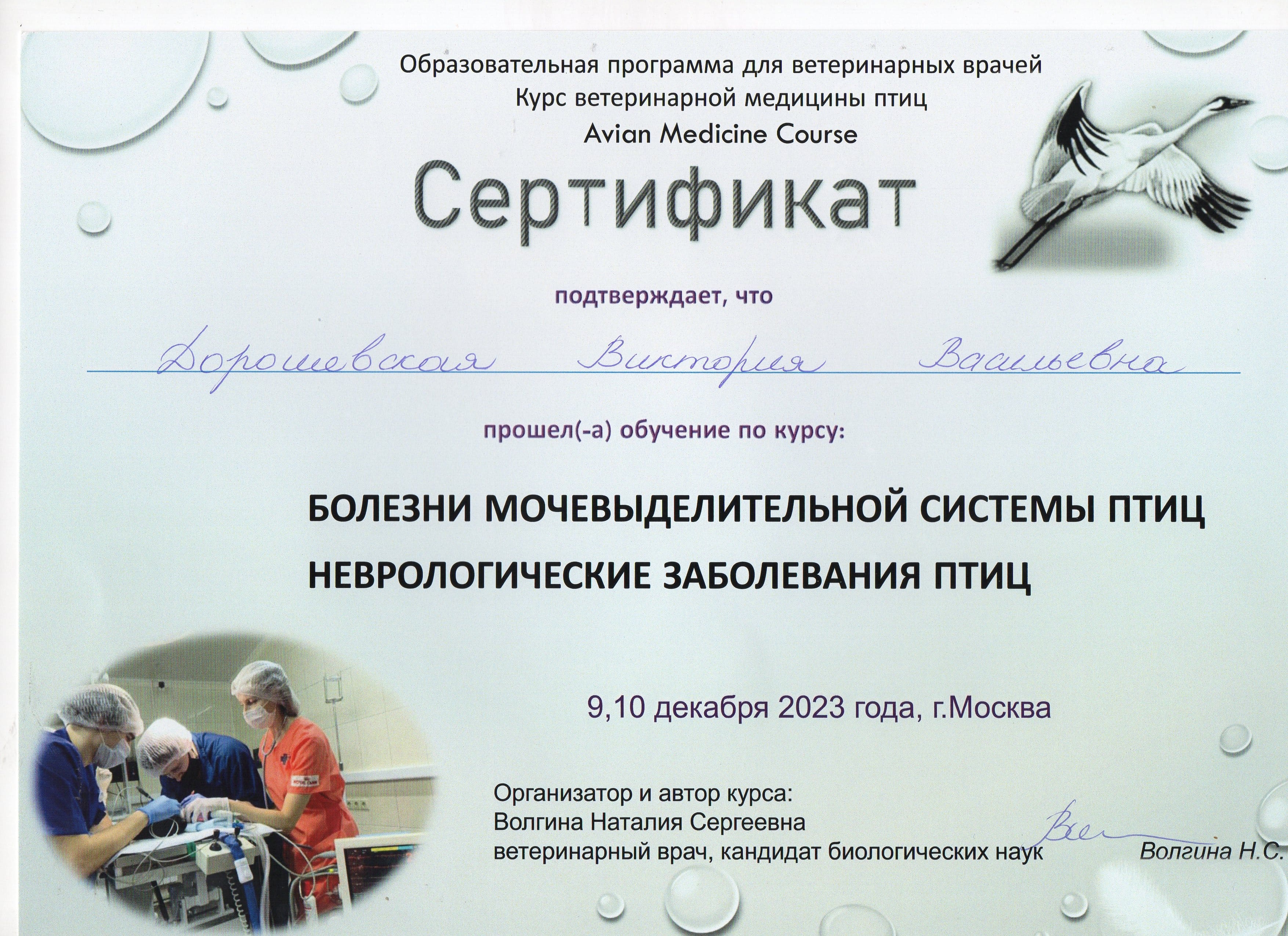 2023 год – образовательная программа для ветеринарных врачей, ветеринарная медицина птиц, курс: «болезни мочевыделительной системы птиц», «неврологические заболевания птиц» под руководством Волгиной Наталии Сергеевны.