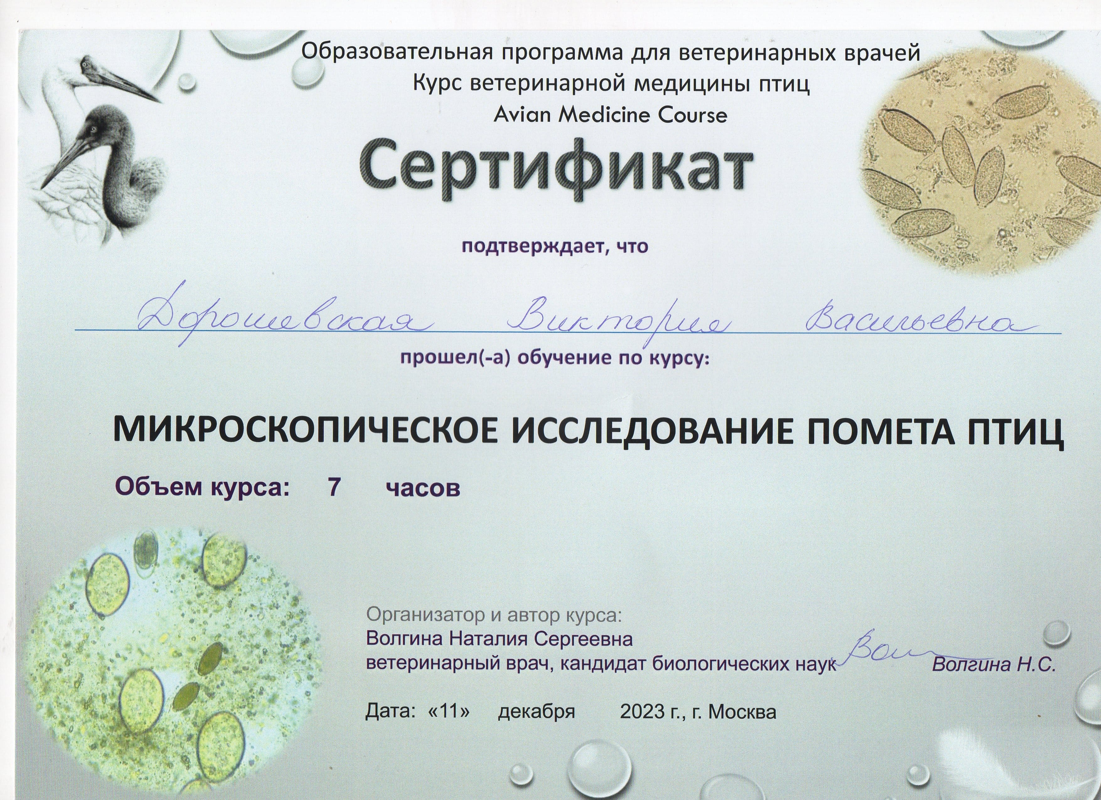 2023 год – образовательная программа для ветеринарных врачей, ветеринарная медицина птиц, теоретико-практический курс: «микроскопическое исследование помета птиц» под руководством Волгиной Наталии Сергеевны.