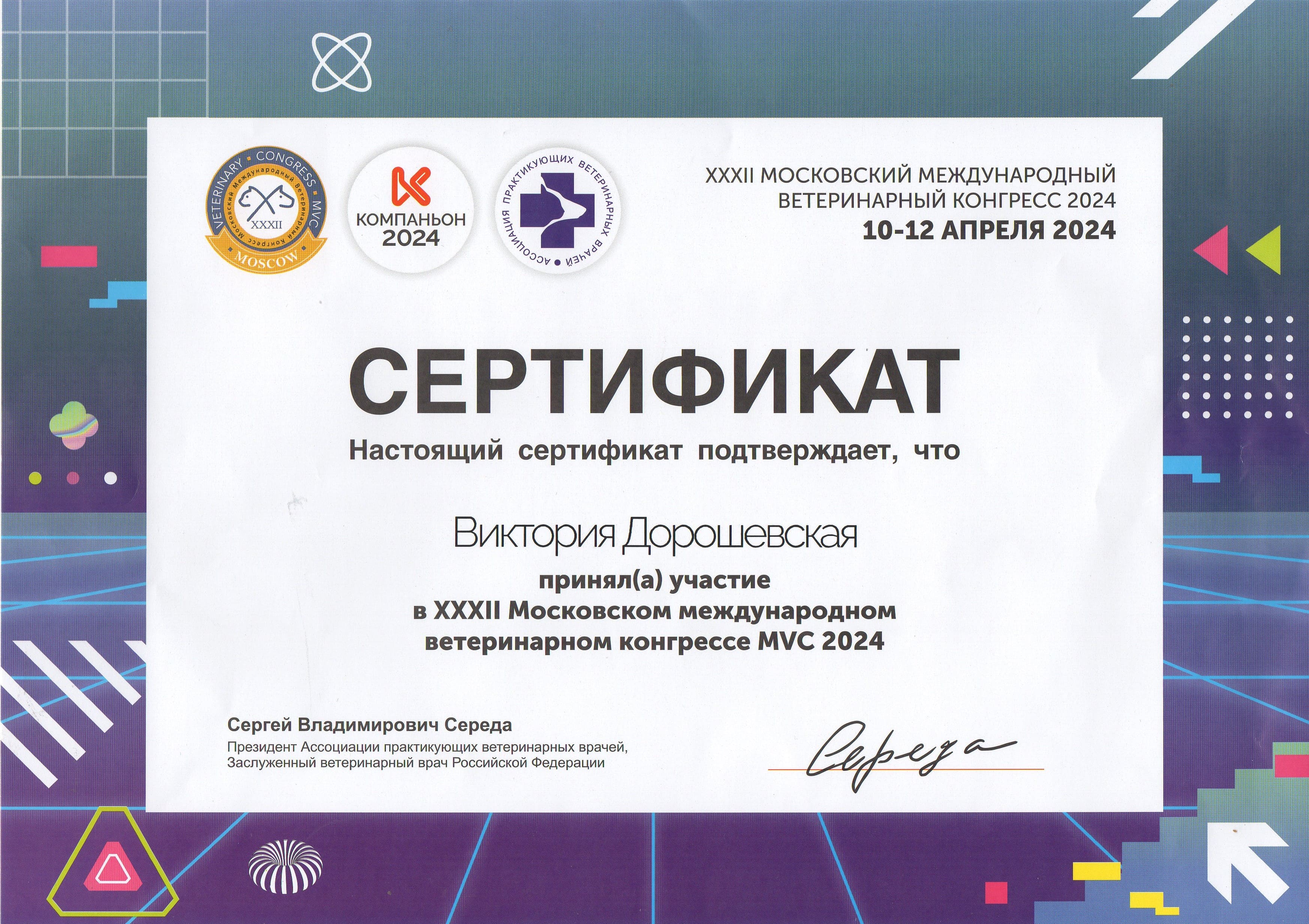 2024 год – приняла участие в XXXII Московском международном ветеринарном конгрессе MVC 2024.