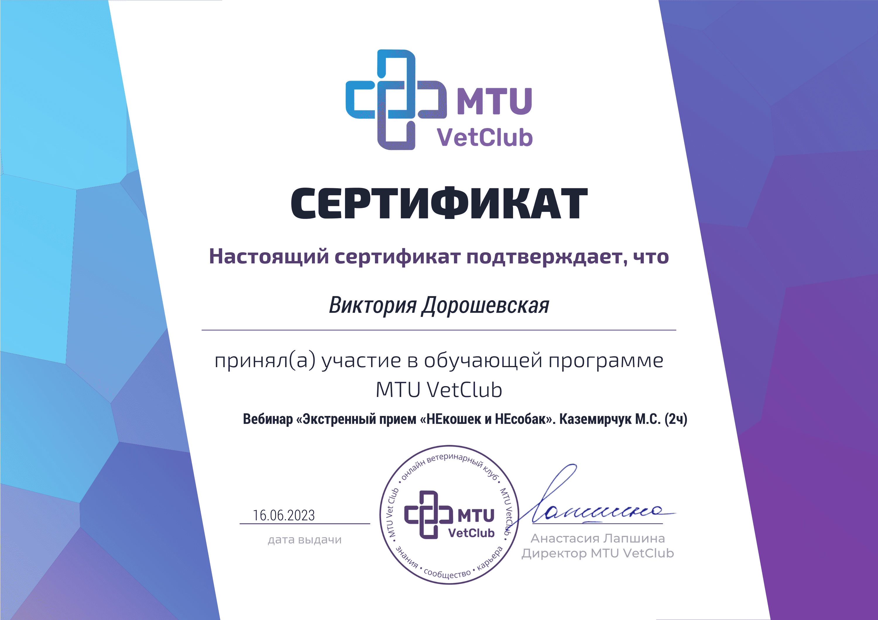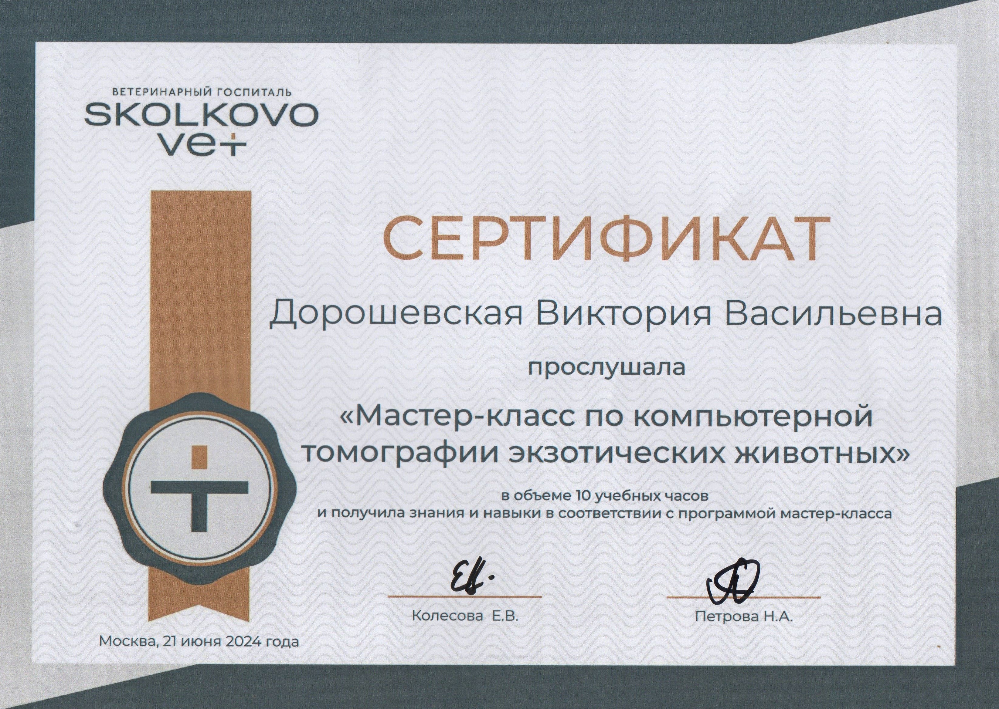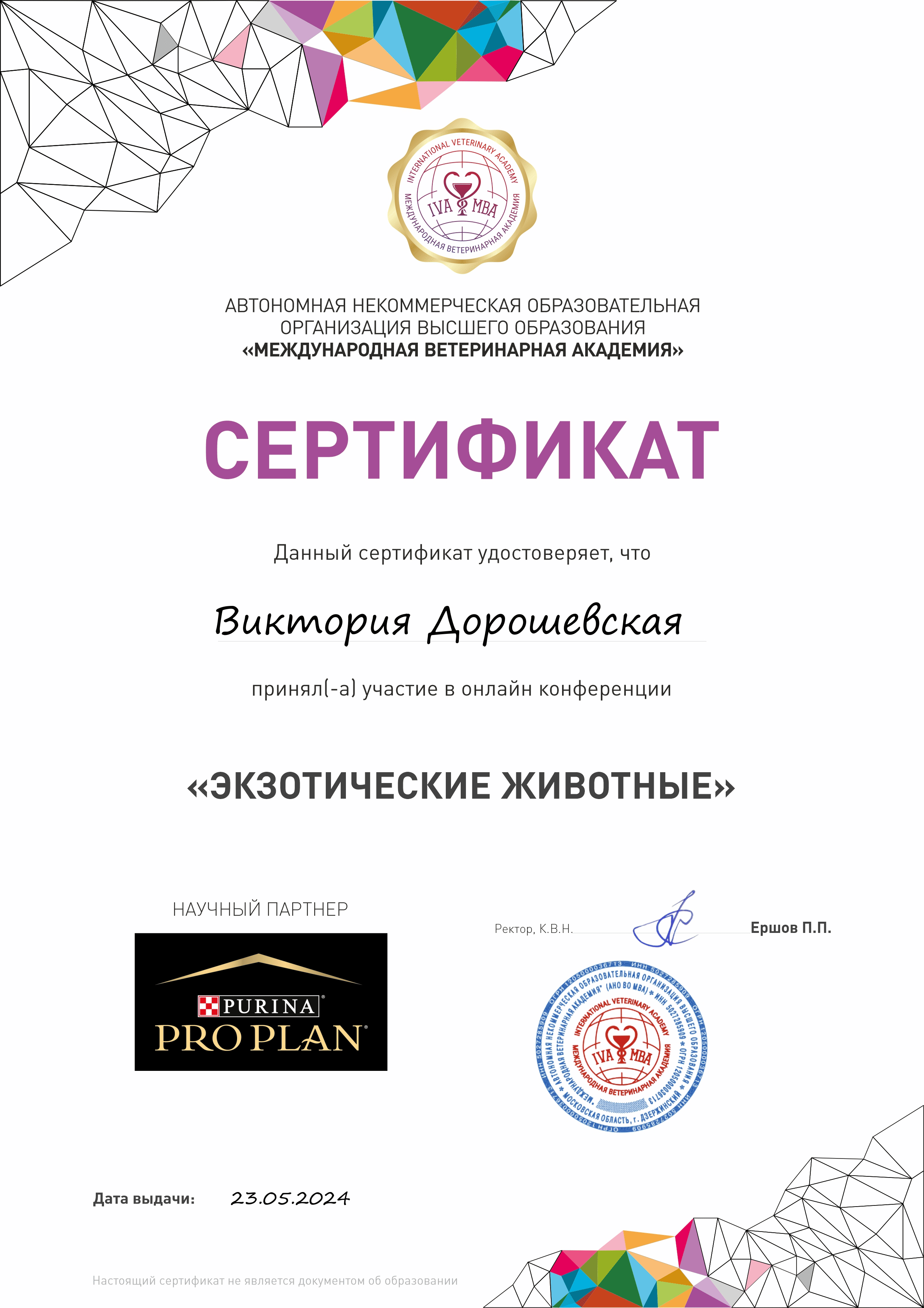 2023 год – окончила расширенный курс от «Уралбиовет-Консалтинг» образовательного проекта «Ветеринарный марафон» на тему: «Экзотические животные».
