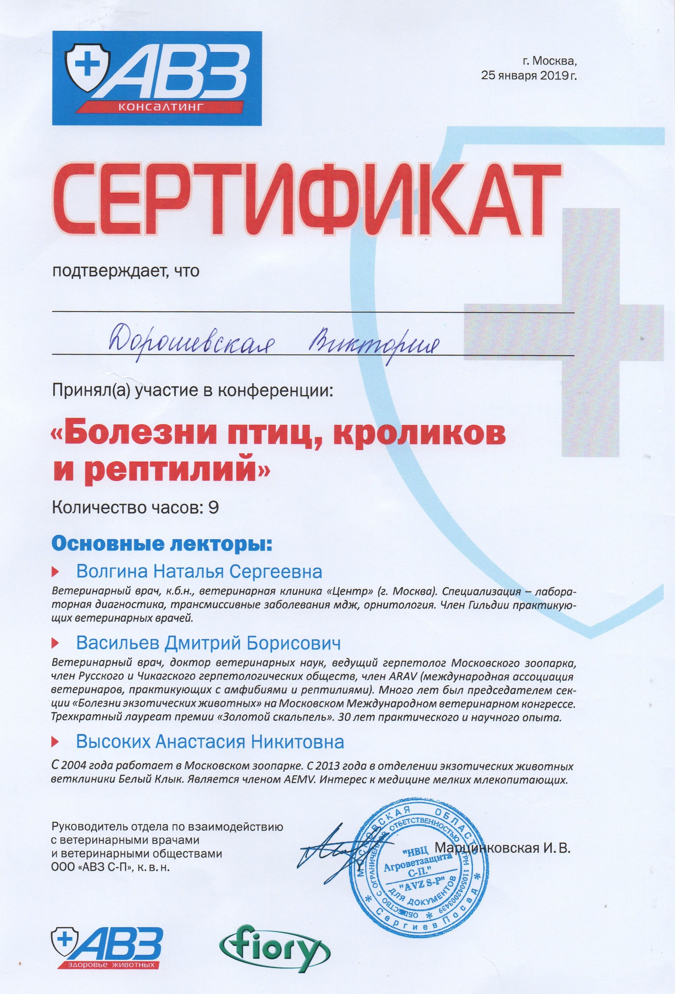 2019 год – участие в конференции «Болезни птиц, кроликов и рептилий» от компании АЗС. Основные лекторы: Волгина Наталья Сергеевна, Васильев Дмитрий Борисович, Высоких Анастасия Никитовна.