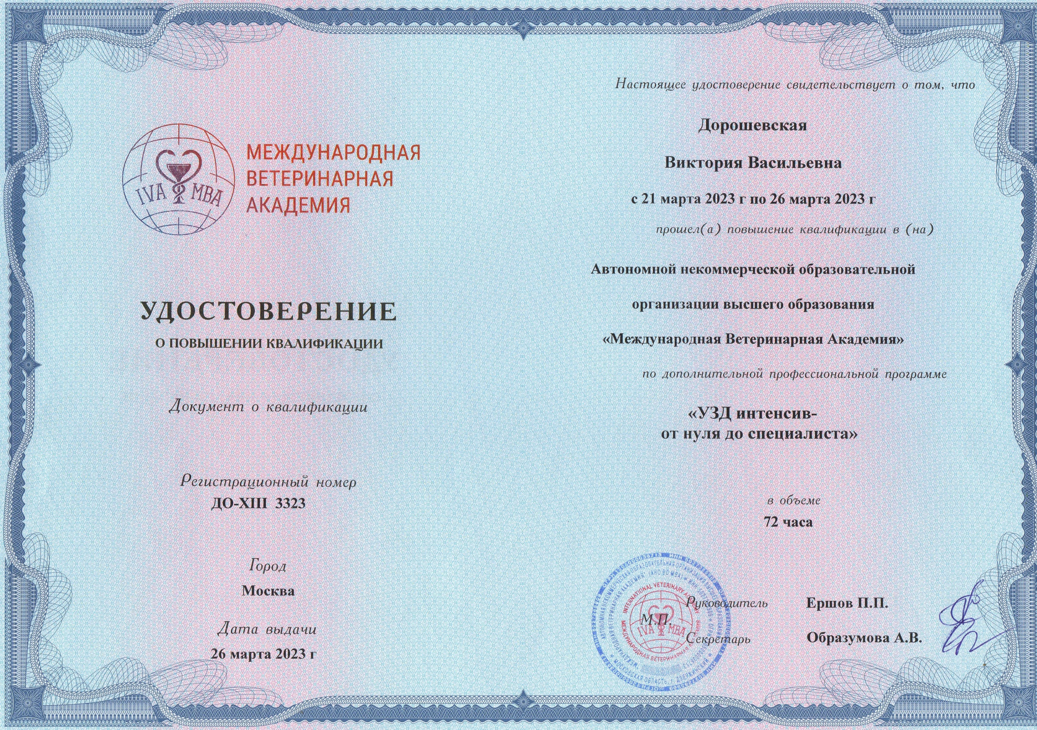 2023 год – прошла курс повышения квалификации в Автономной некоммерческой образовательной организации высшего образования «Международная Ветеринарная Академия» по дополнительной профессиональной программе «УЗД интенсив – от нуля до специалиста». Под руководством Дунаевой Елены Петровны.