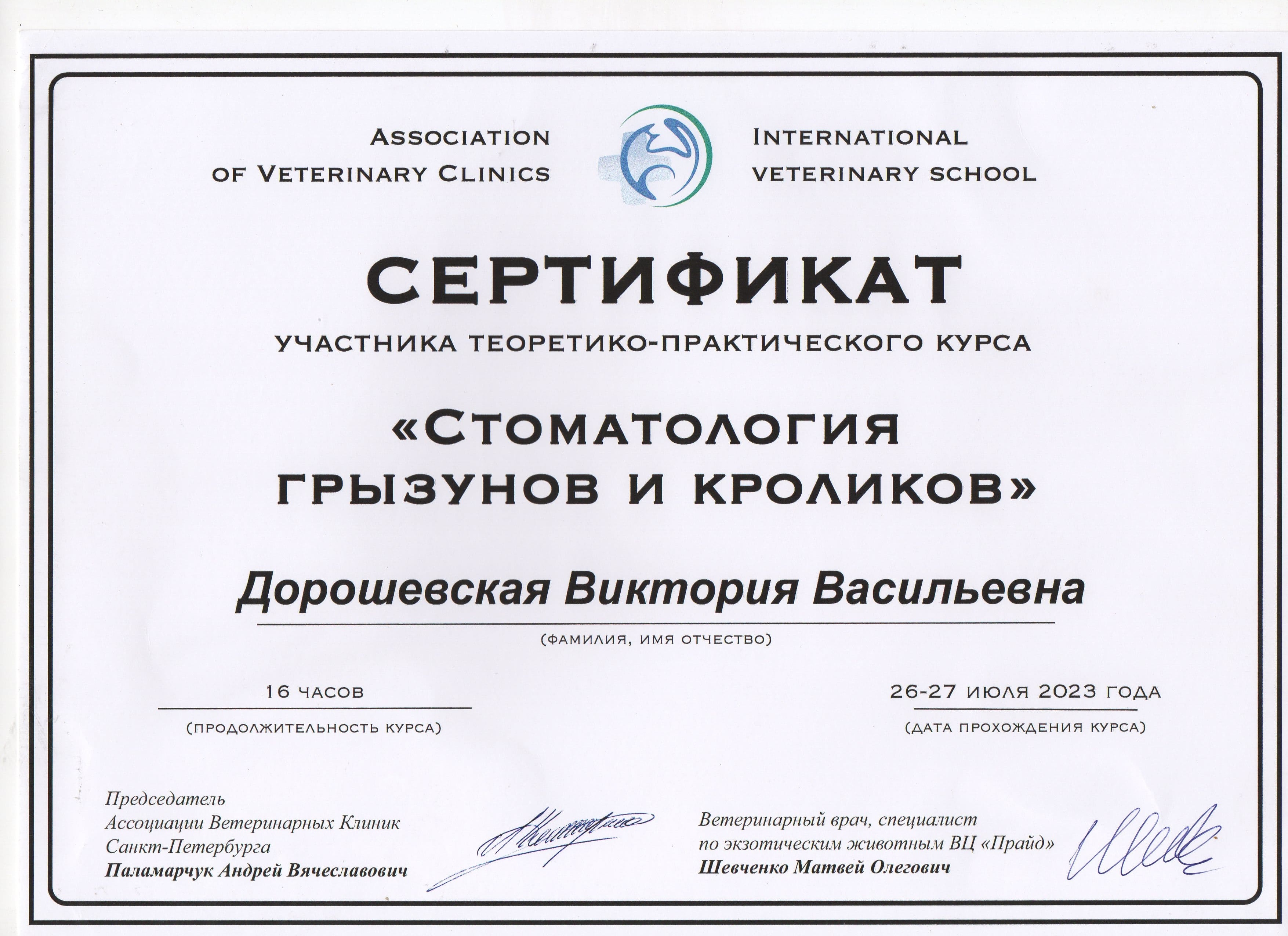 2023 год – теоретико-практический курс «Стоматология грызунов и кроликов» под руководством Шевченко Матвея Олеговича.