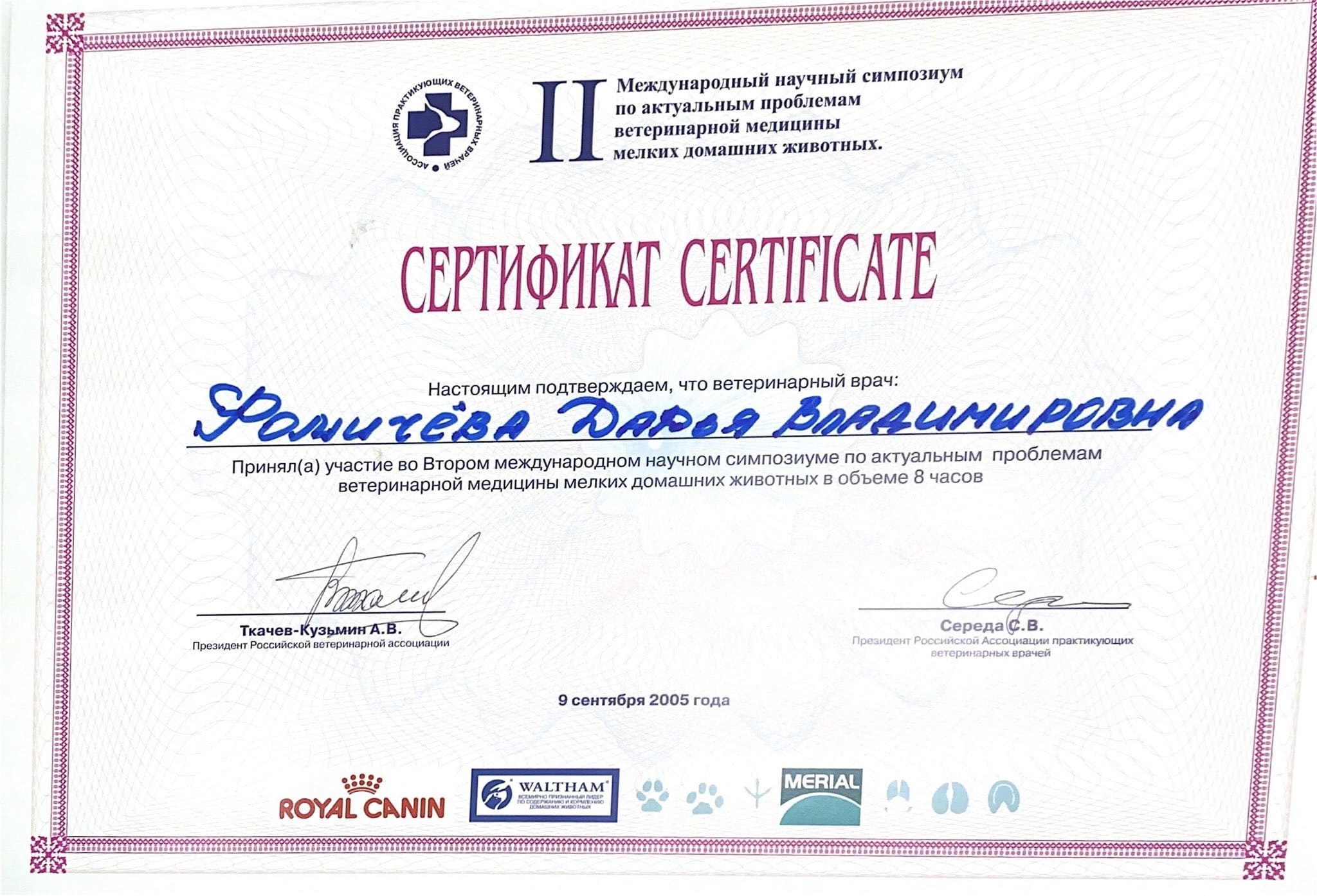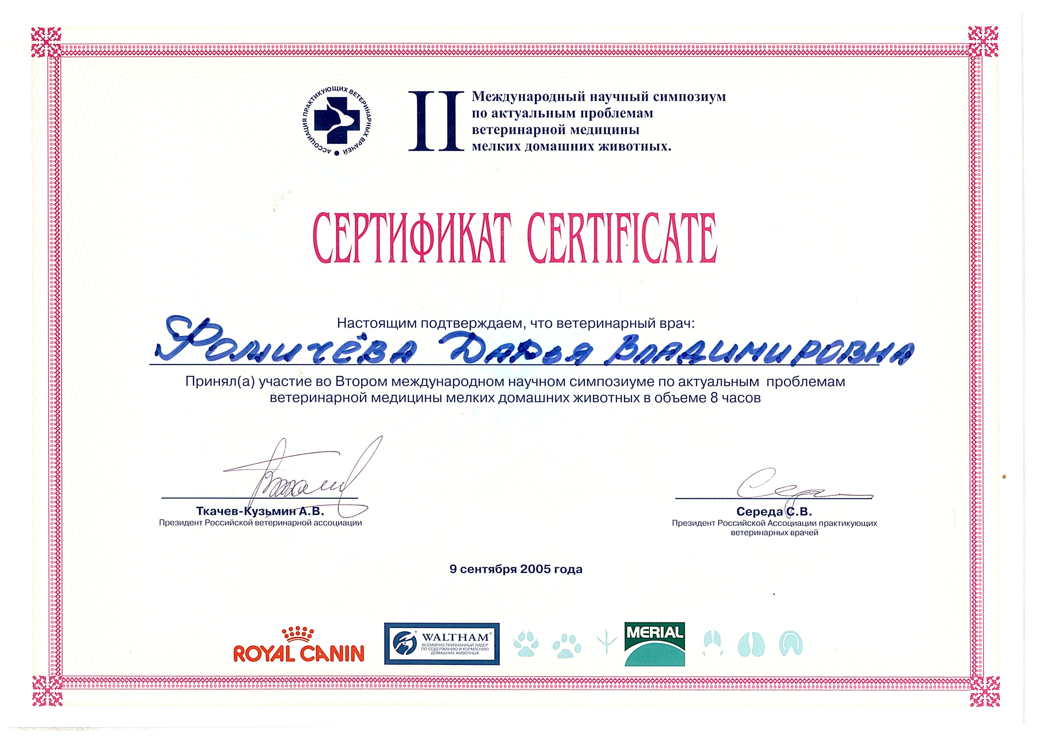 2005 год – приняла участие во Втором международном научном симпозиуме по актуальным проблемам ветеринарной медицины мелких домашних животных.