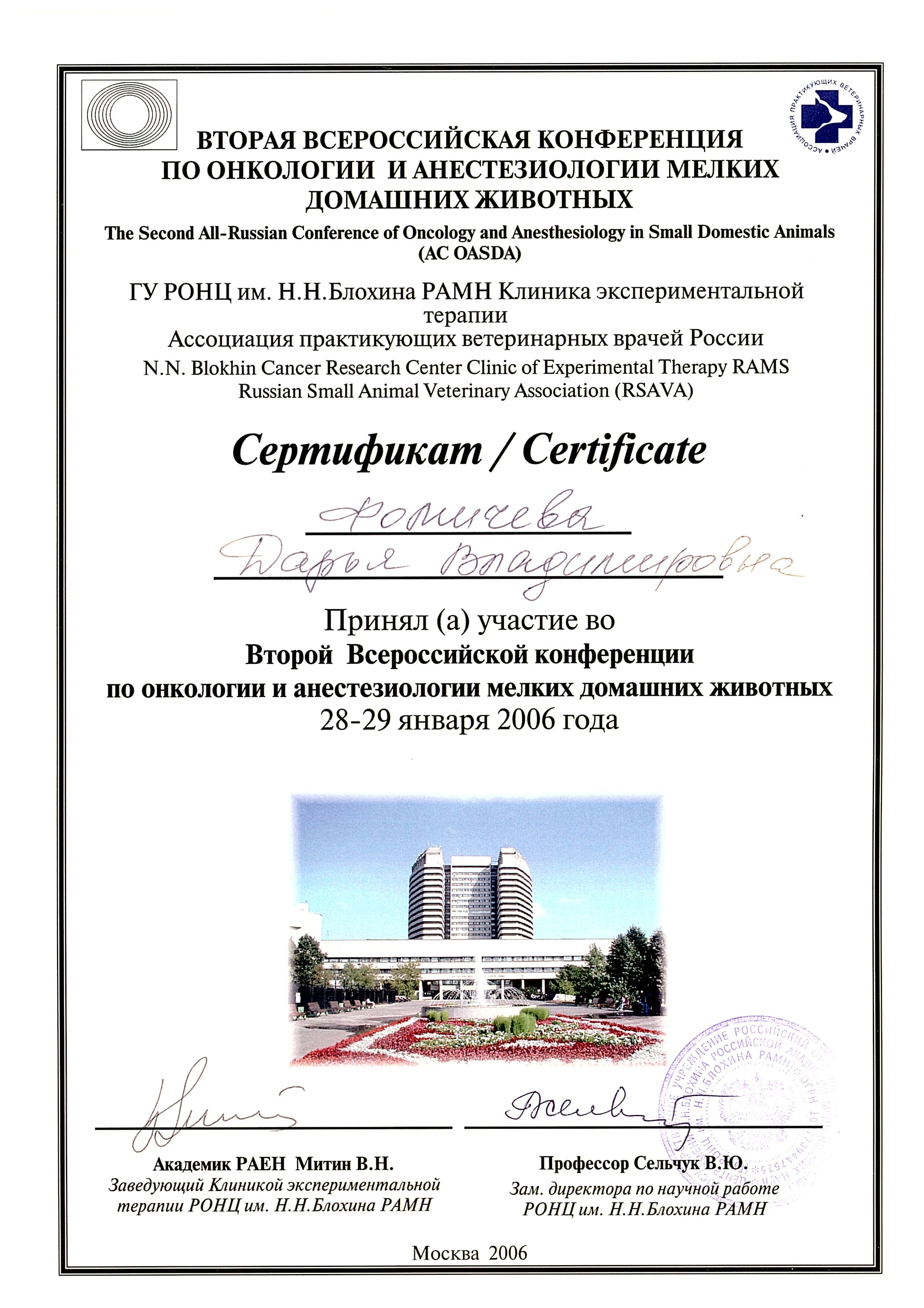 2006 год – приняла участие во Второй Всероссийской конференции по онкологии и анестезиологии мелких домашних животных в ГУ РОНЦ им. Н. Н.Блохина РАМН Клиника экспериментальной терапии.