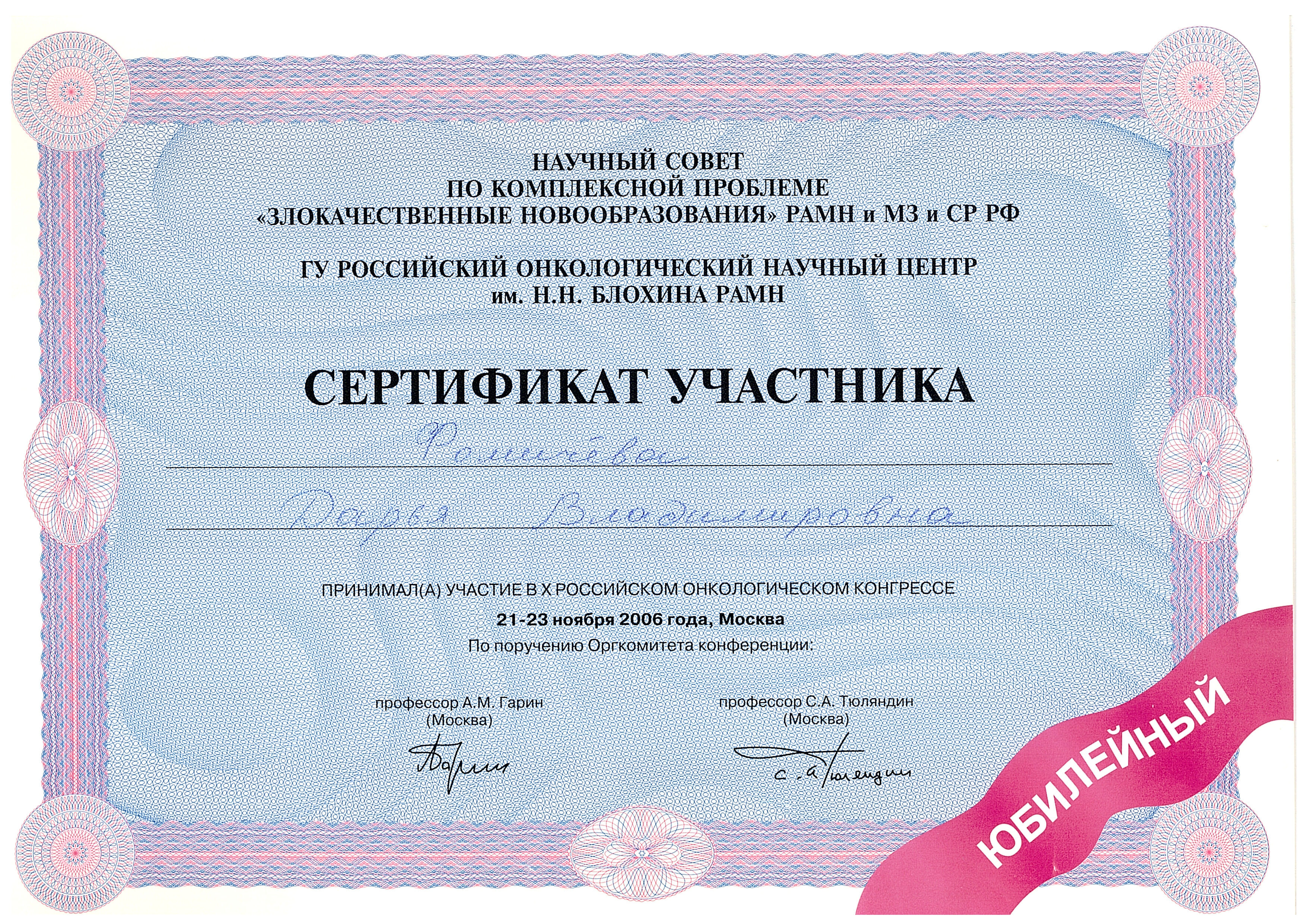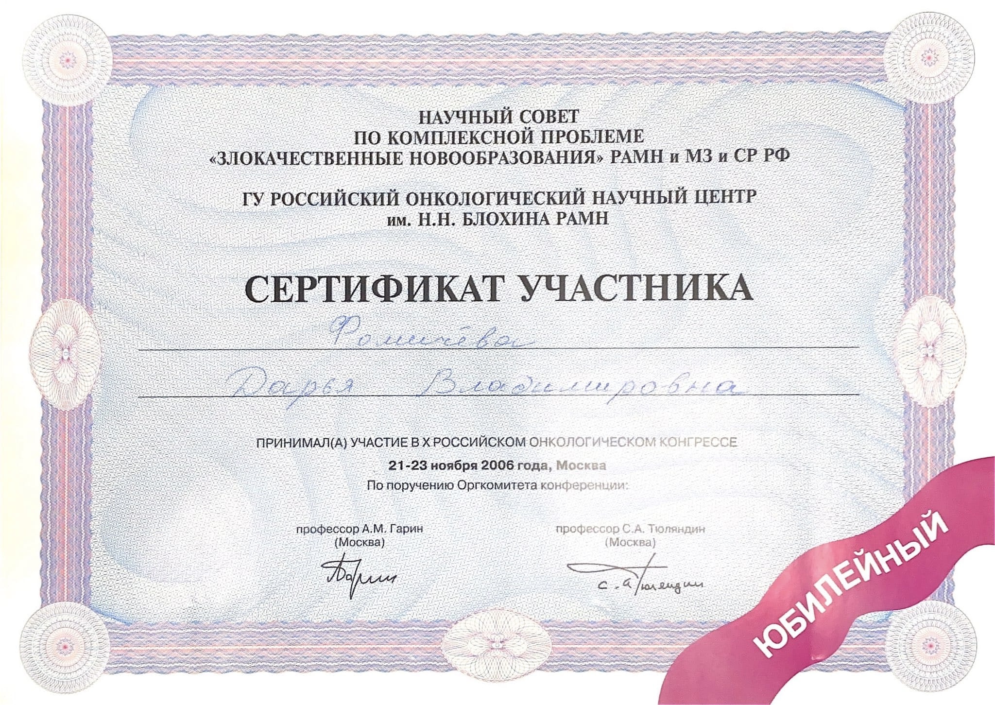 2006 год – приняла участие в Х Российском онкологическом конгрессе в ГУ РОНЦ им. Н. Н.Блохина РАМН Клиника экспериментальной терапии.