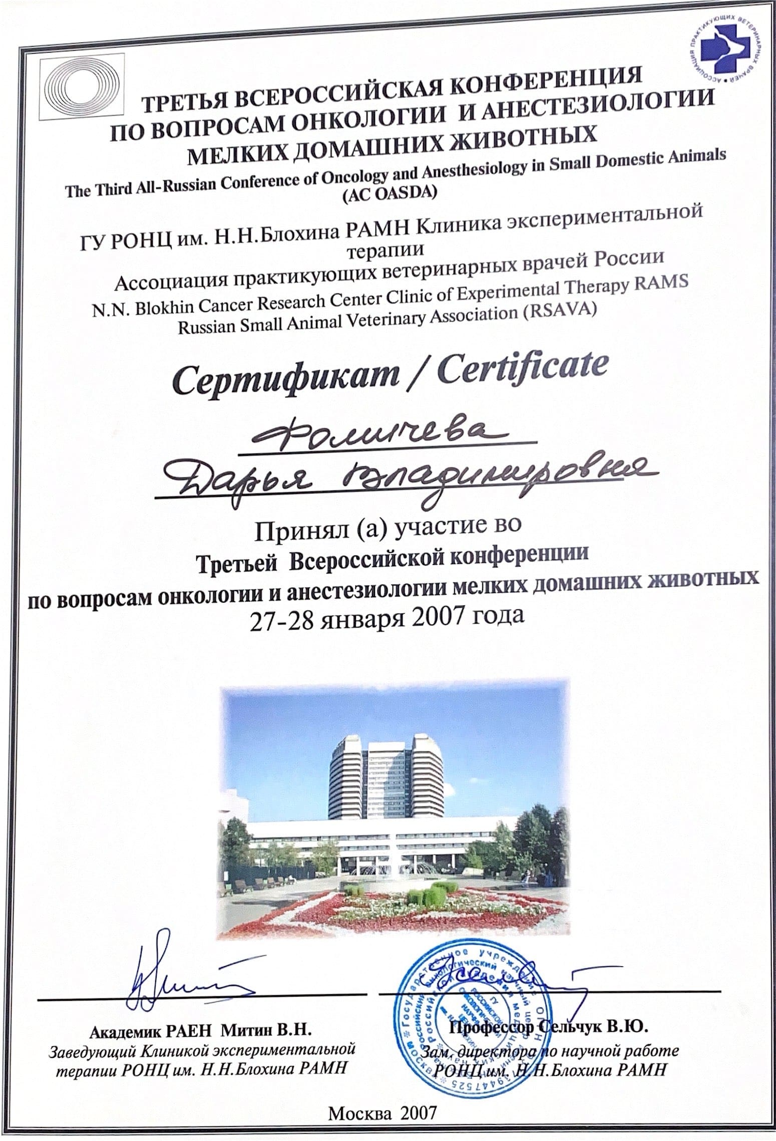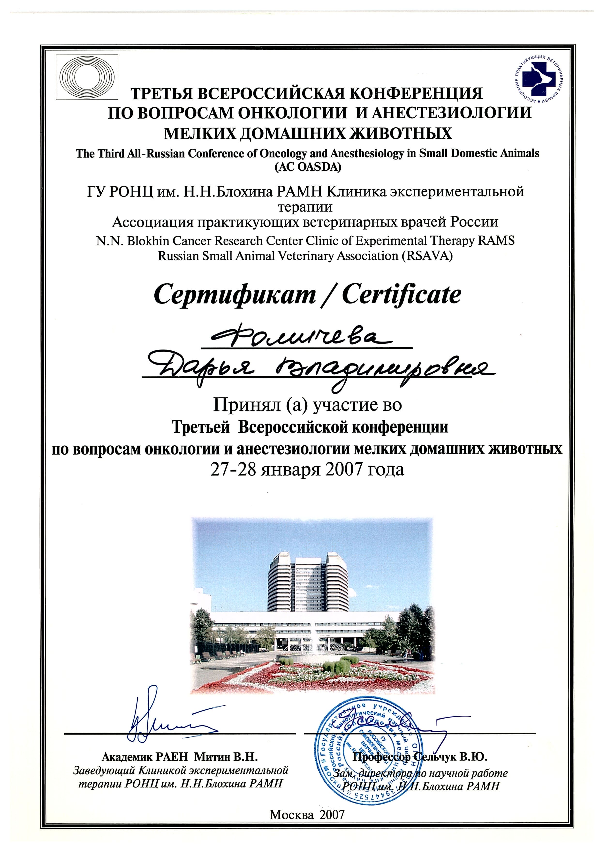 2007 год – приняла участие в Третьей Всероссийской конференции по вопросам онкологии и анестезиологии мелких домашних животных в ГУ РОНЦ им. Н. Н.Блохина РАМН Клиника экспериментальной терапии.