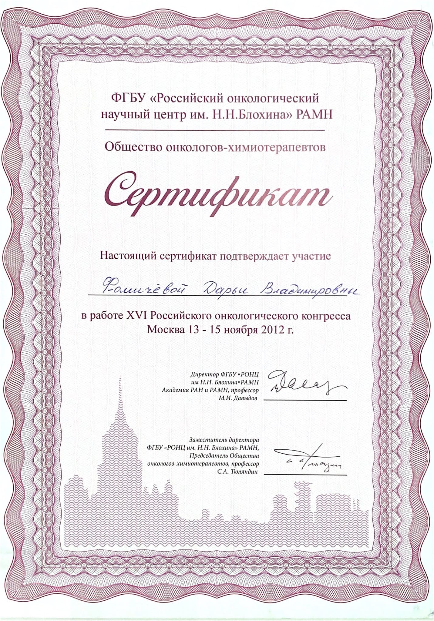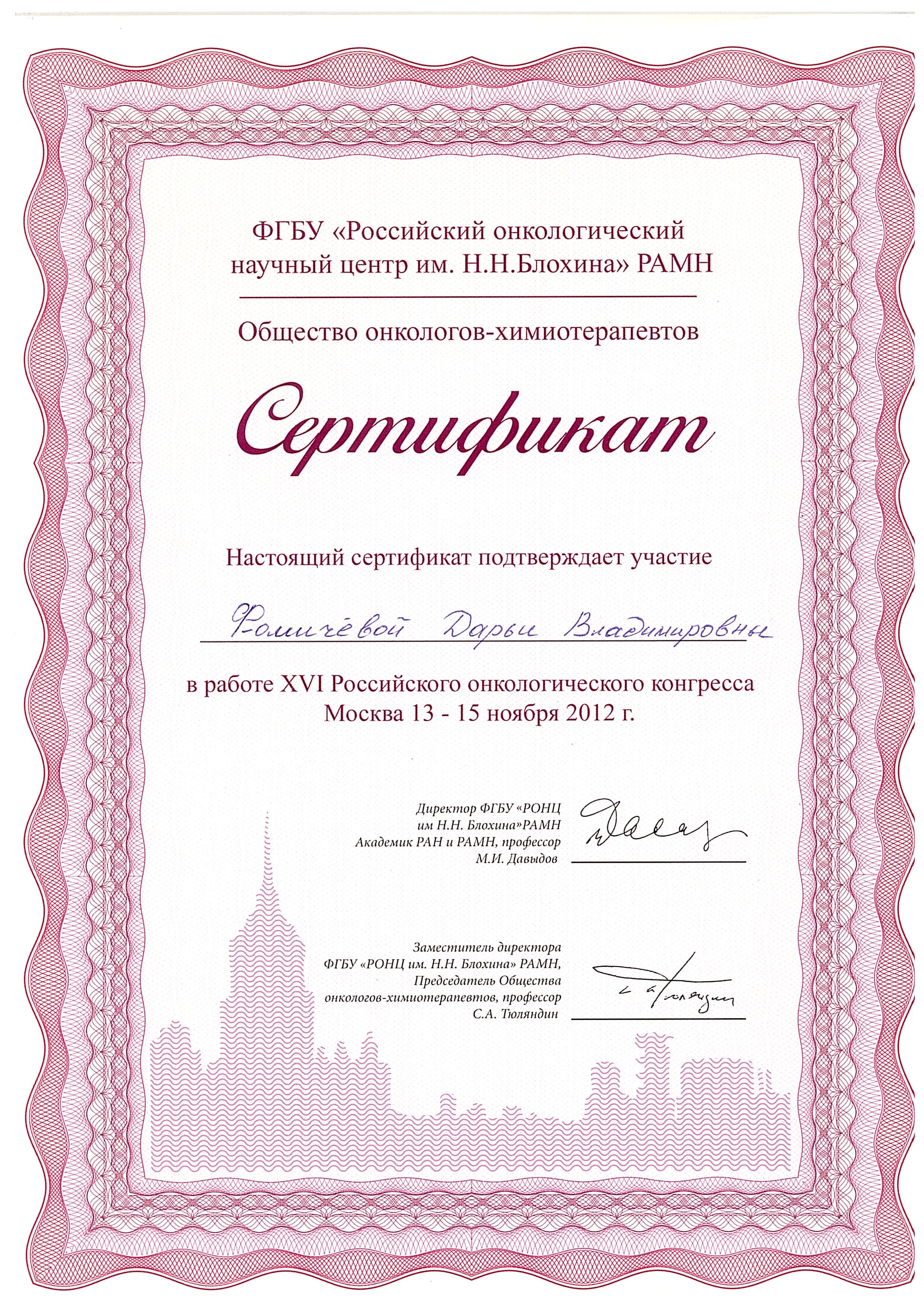 2012 год – участвовала в работе XVI Российского онкологического конгресса в ФГБУ «Российский онкологический научный центр им. Н.Н.Блохина» PAMH.