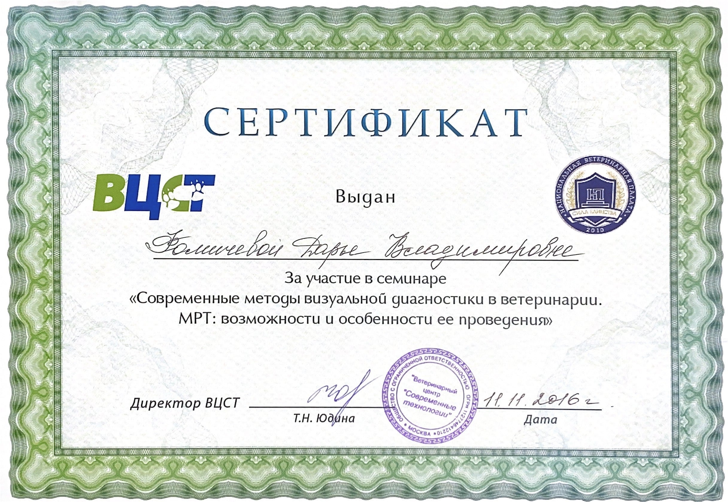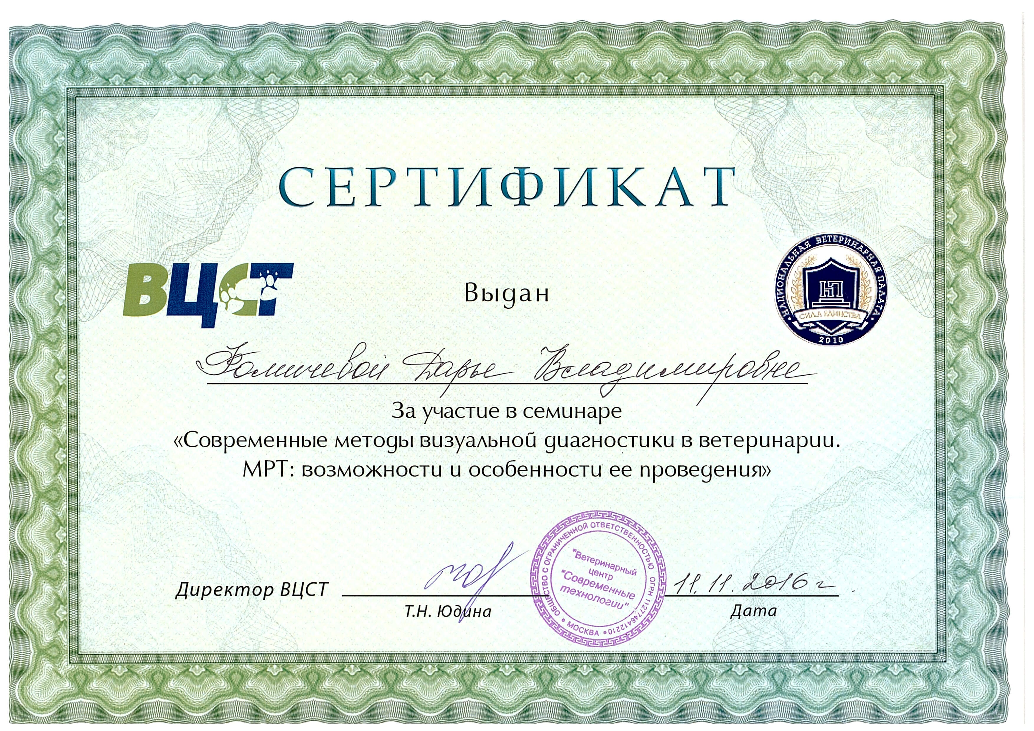 2016 год – участие в семинаре «Современные методы визуальной диагностики в ветеринарии. МРТ: возможности и особенности ее проведения» в ВЦСТ.