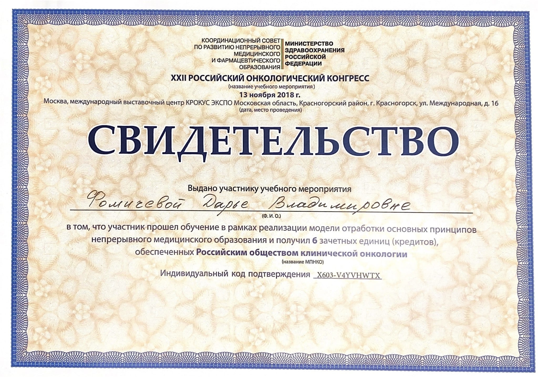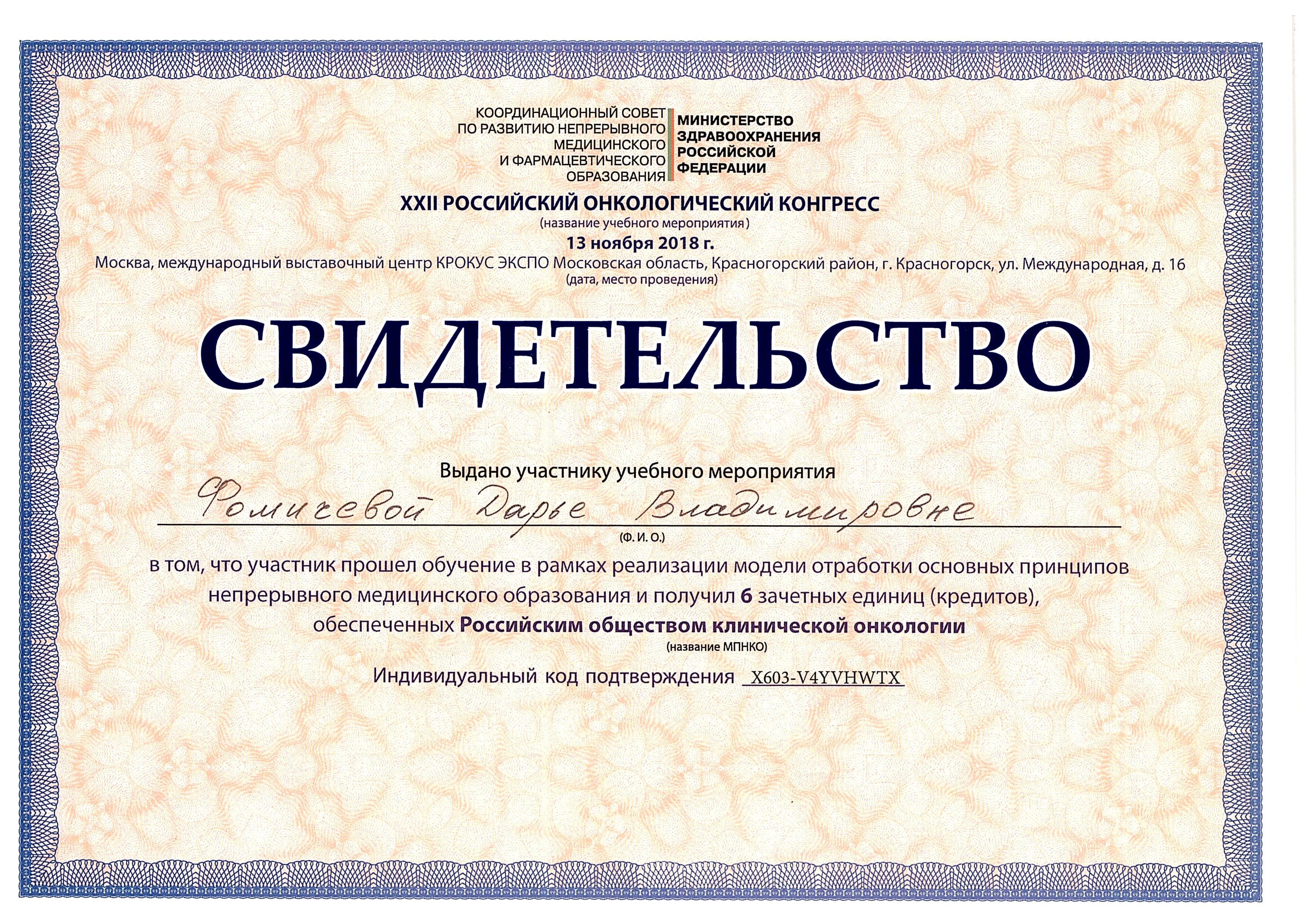 2018 год – прошла обучение в рамках реализации модели отработки основных принципов непрерывного медицинского образования и получила 6 зачетных единиц (кредитов), обеспеченных Российским обществом клинической онкологии в XХII Российском онкологическом конгрессе.