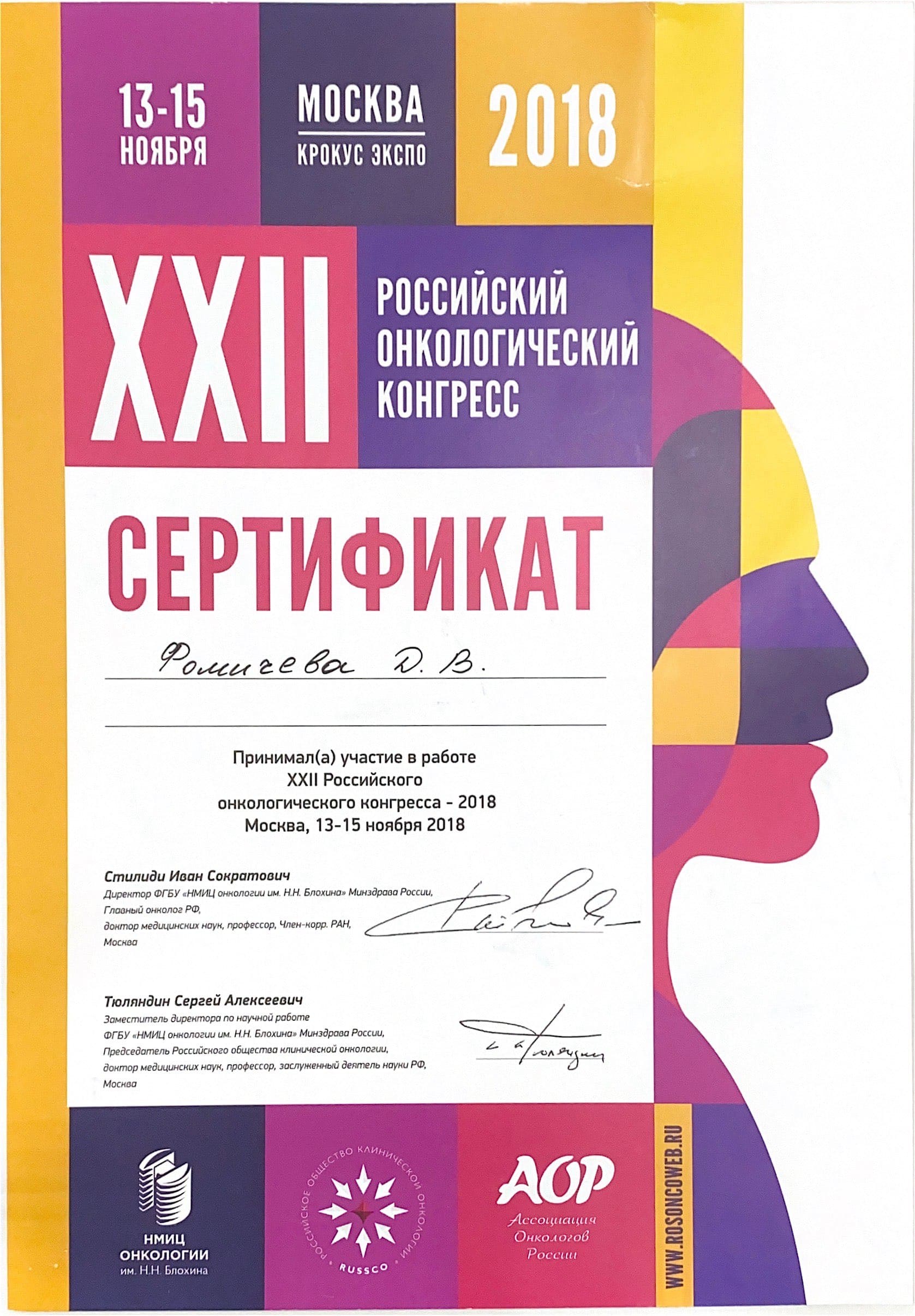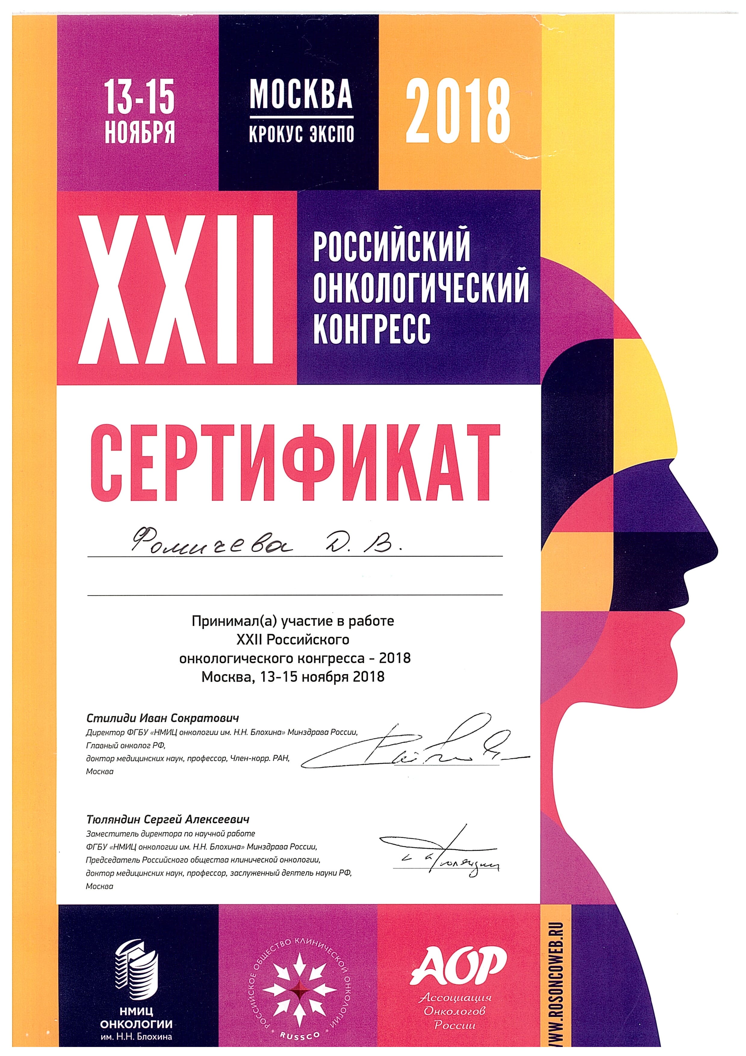 2018 год – приняла участие в работе XXII Российского онкологического конгресса.