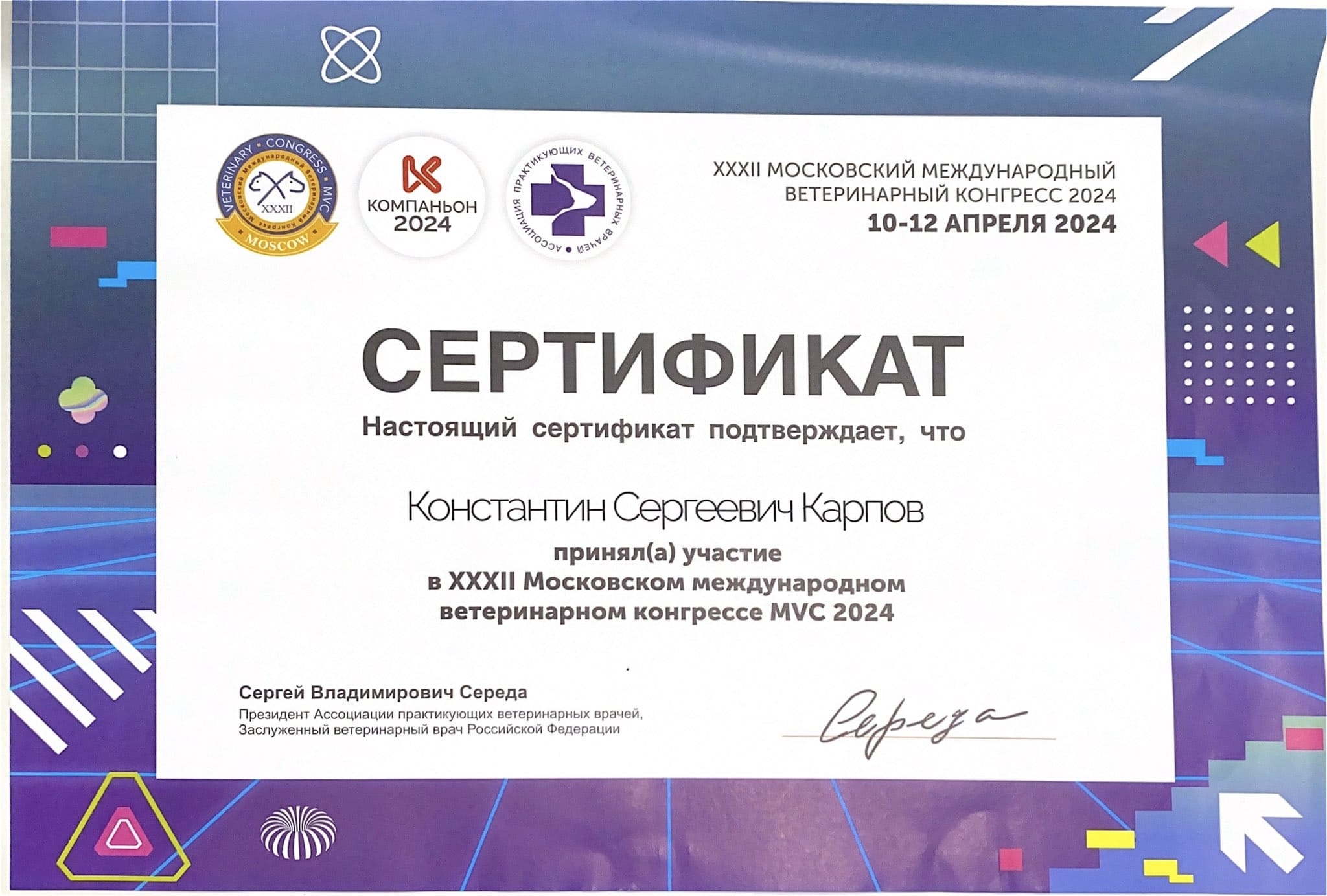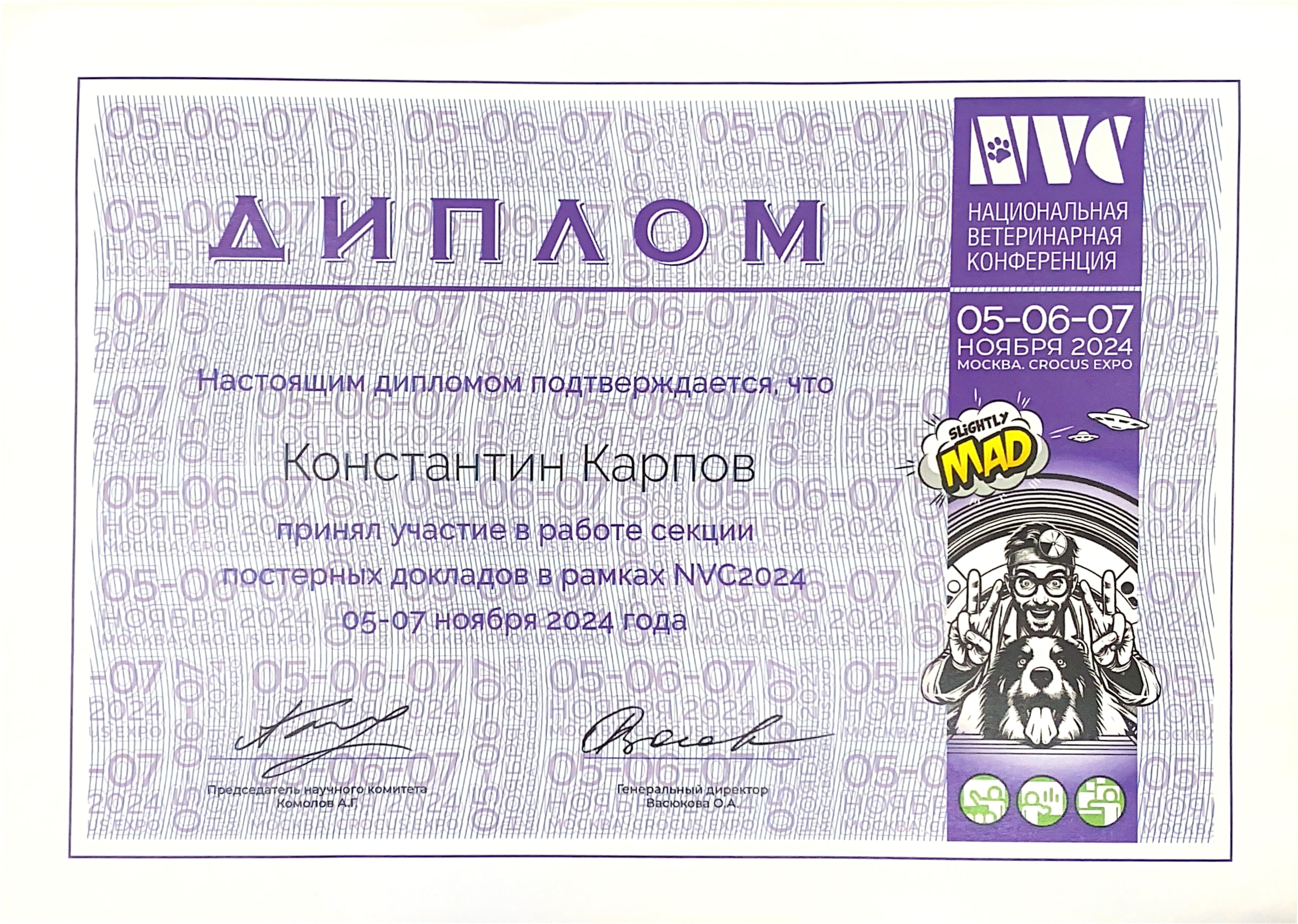2024 год – принял участие в качестве докладчика в XXXII Московском международном ветеринарном конгрессе (MVC).