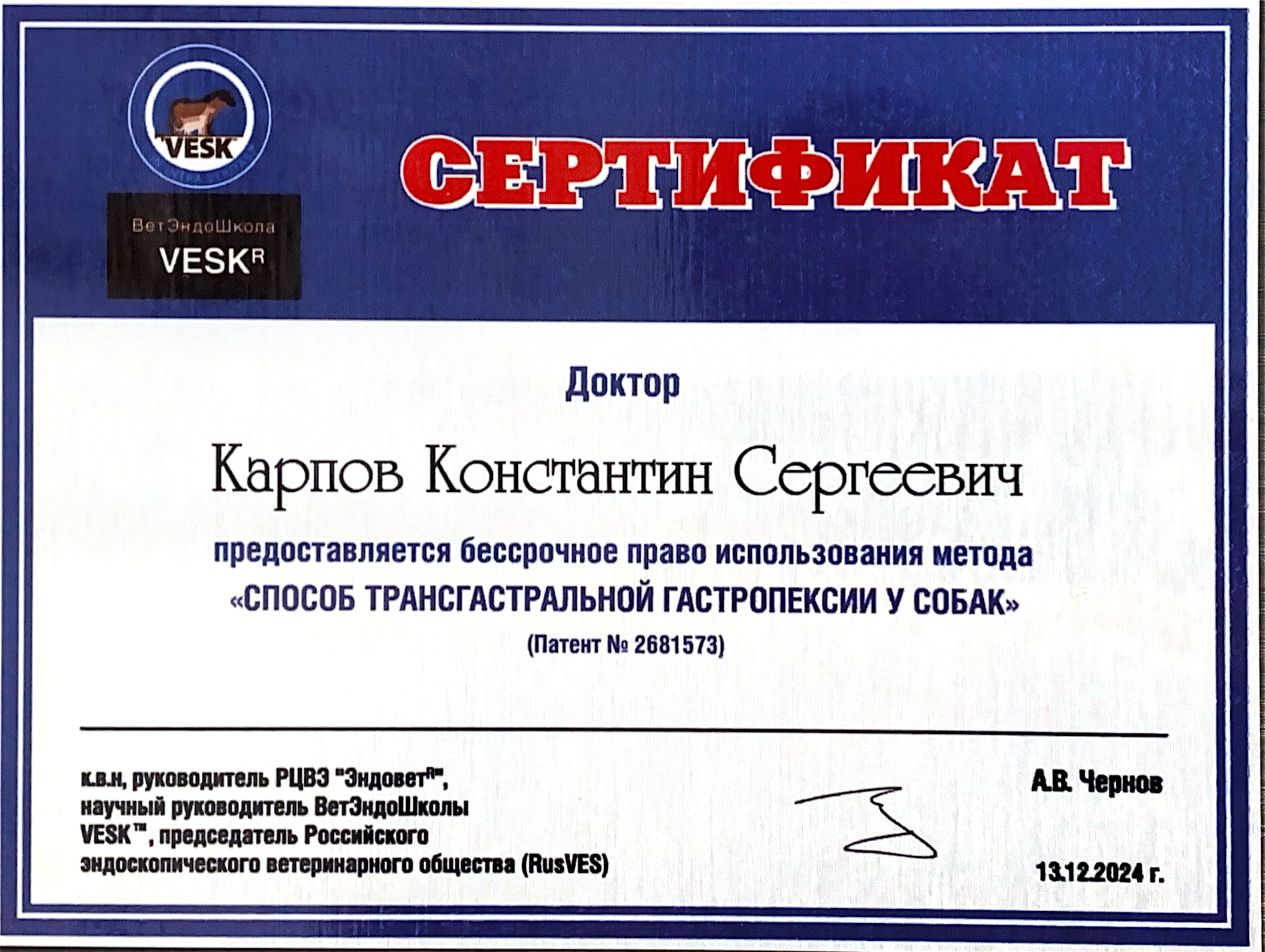 2024 год – прошел мастер-класс по гастроэнтерологии в Ветэндошколе «VESK», продвинутый курс. Обучился гастроскопически проводить гастропексию.