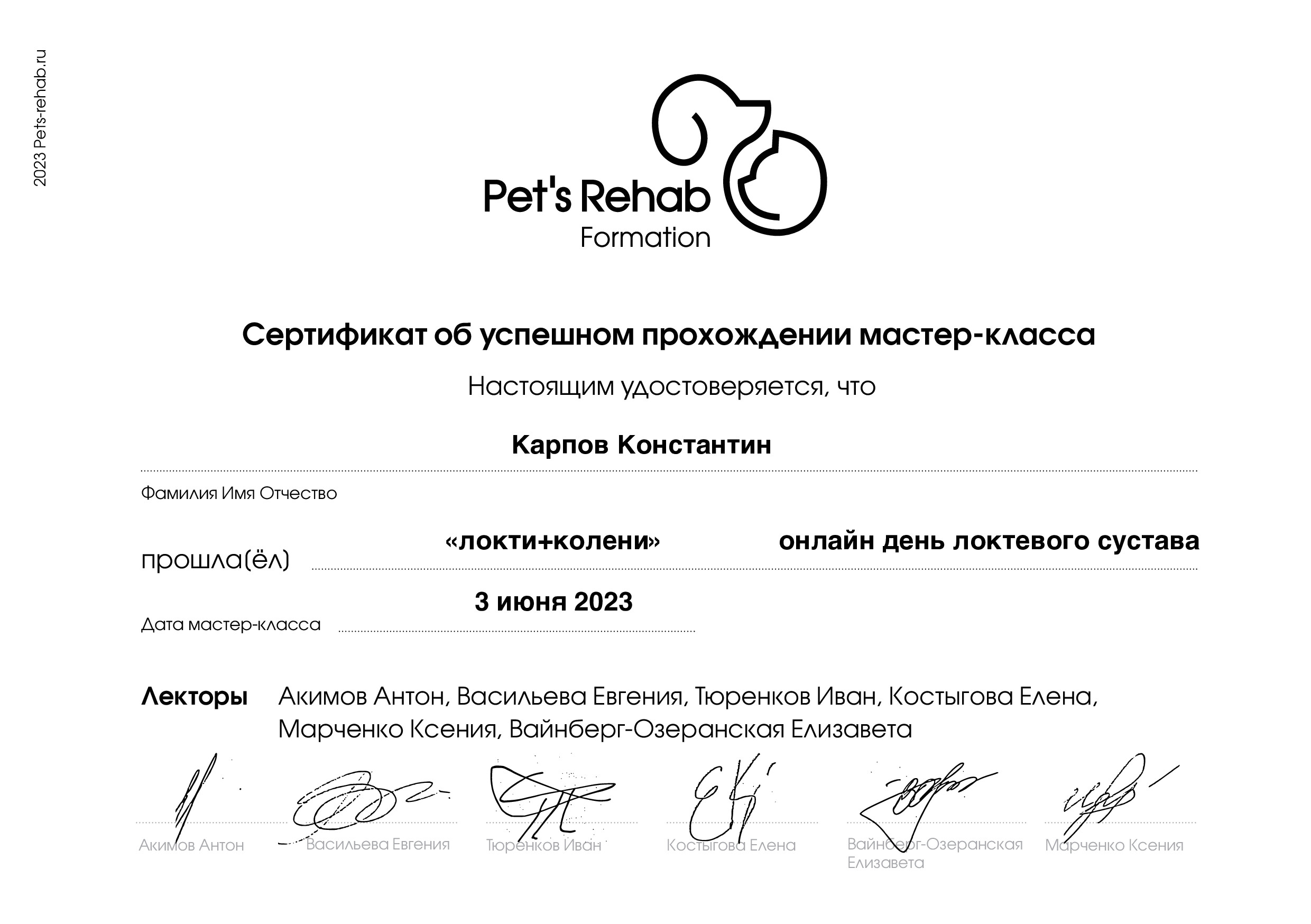 2023 год – прошёл мастер-класс по заболеванию локтевых суставов в Pet's Rehab Formation.