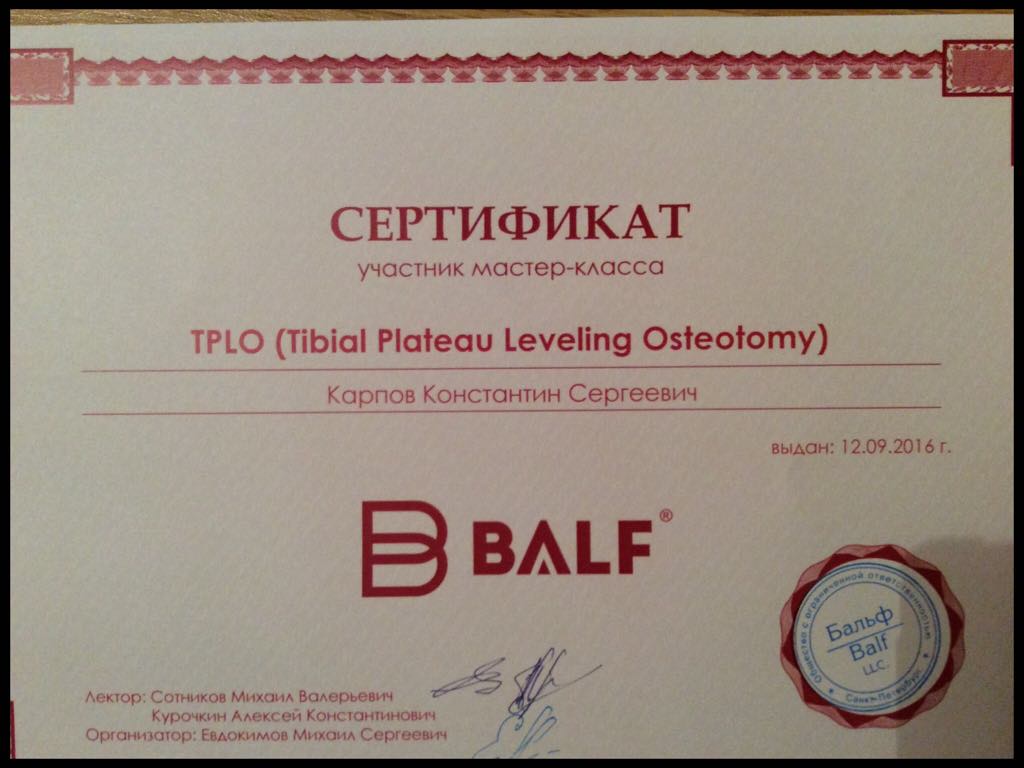 2016 год – прошёл мастер-класс «TPLO» , лектор Сотников Михаил Валерьевич и Курочкин Алексей Константинович.