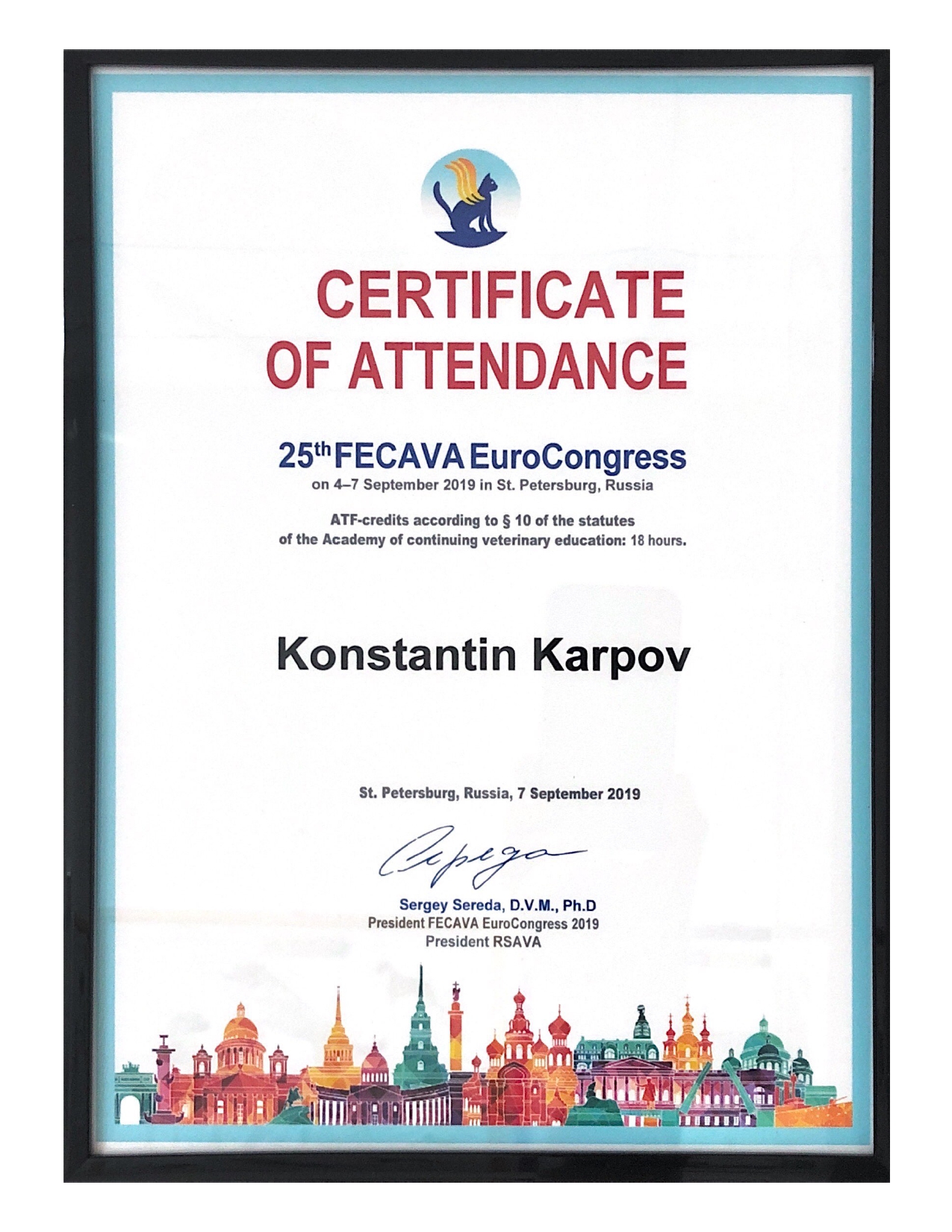 2019 год – слушатель на Европейской ветеринарной конференции (FECAVA) , Санкт-Петербург.