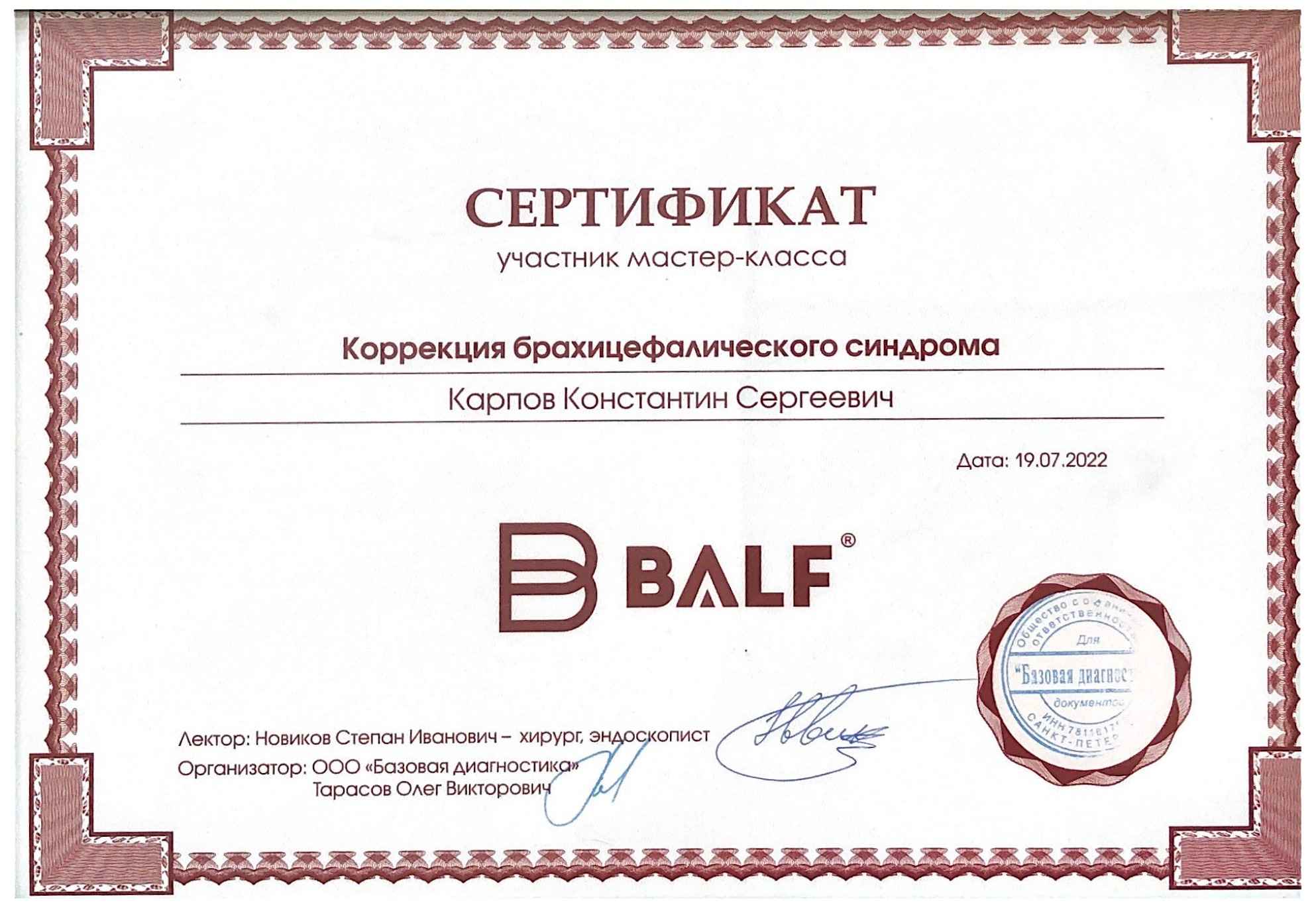 2022 год – прошёл мастер-класс «Коррекция Брахиоцефалического синдрома».