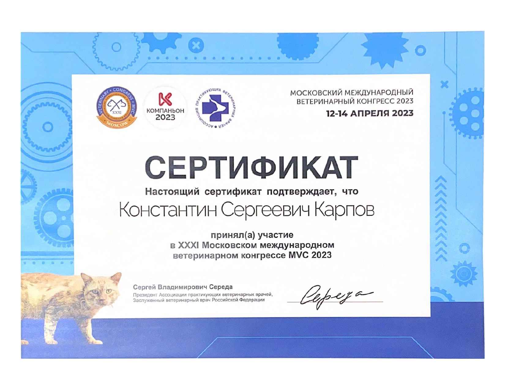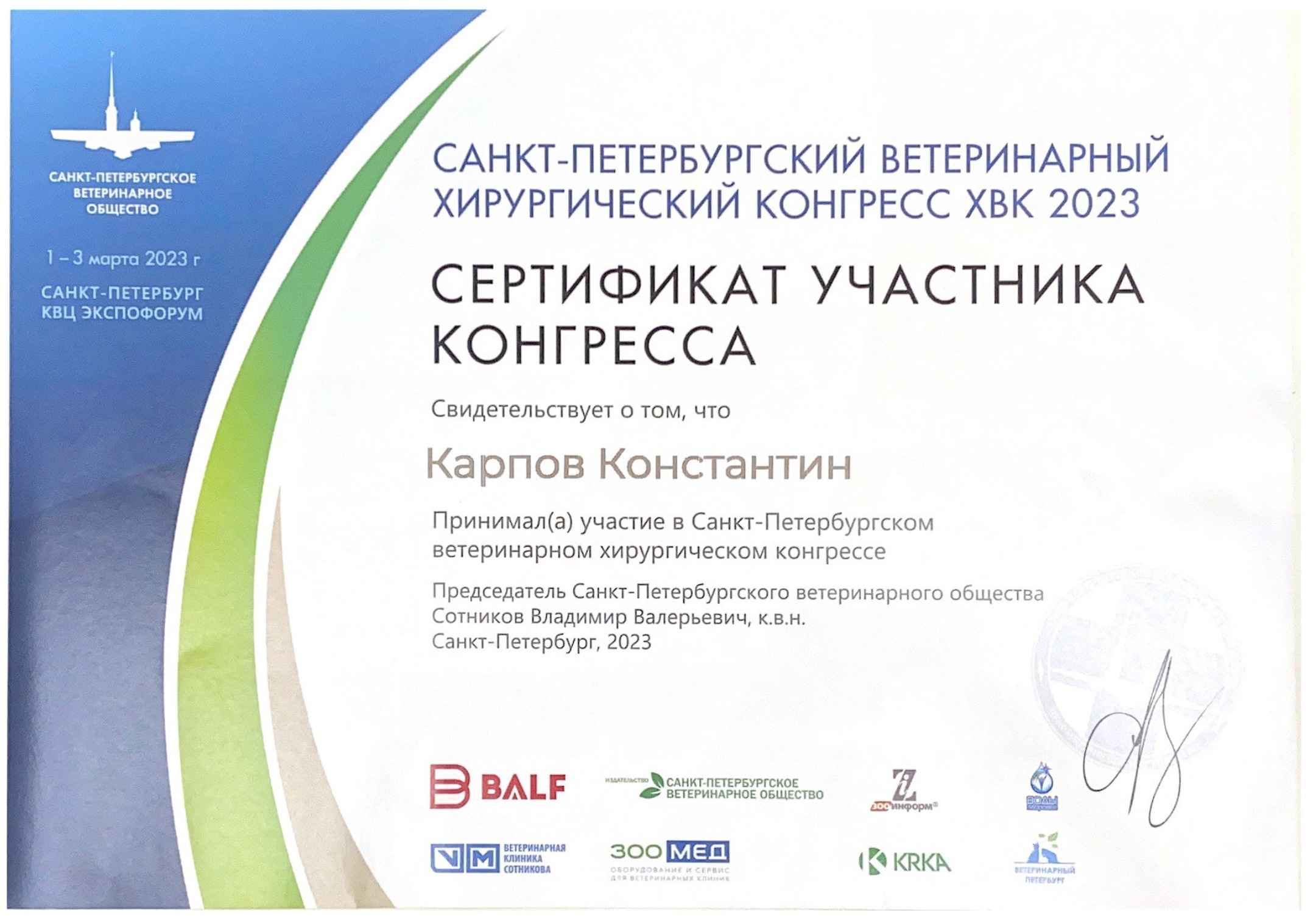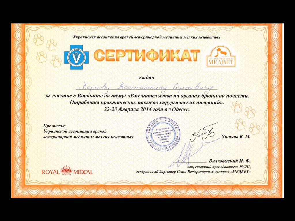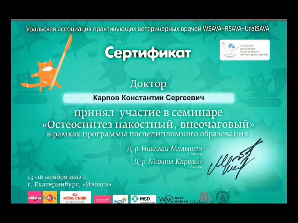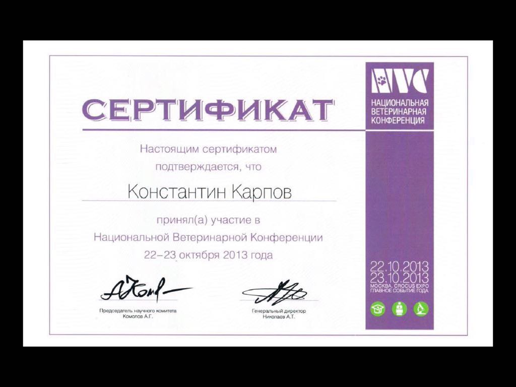 2013 год – слушатель Санкт-Петербургской ветеринарной конференции по хирургии.