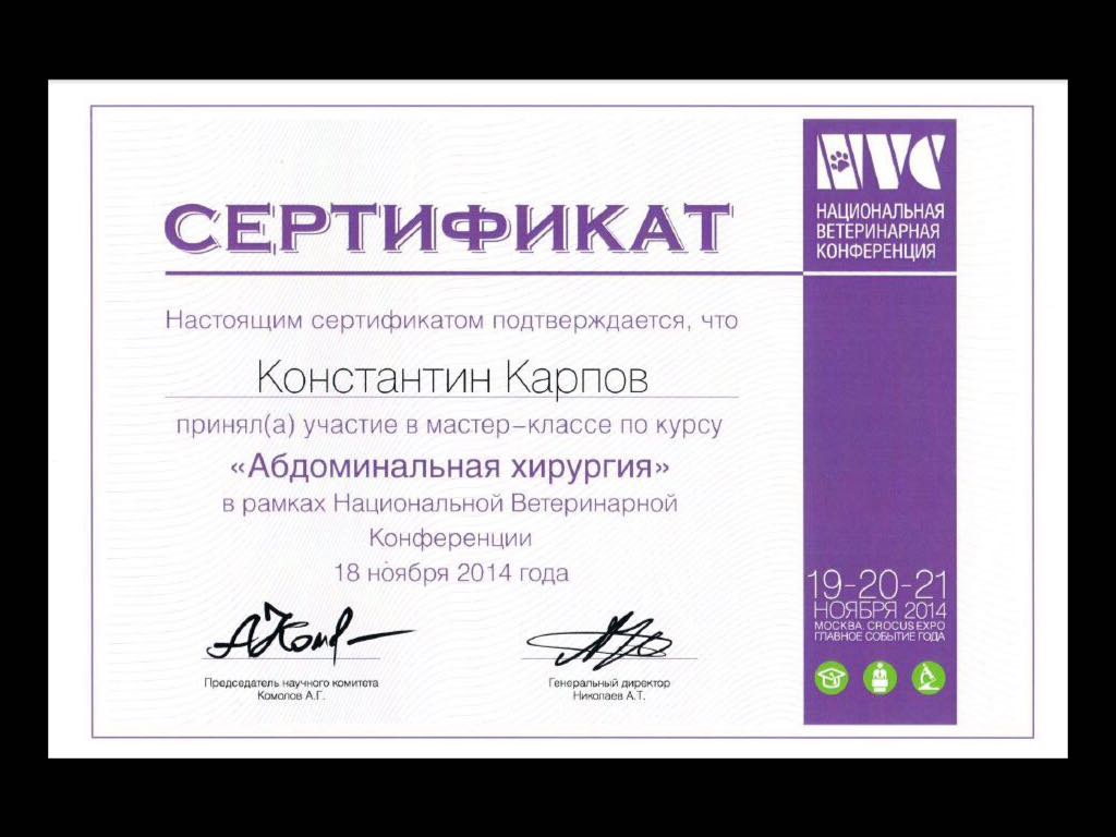 2014 год – прошёл мастер-класс «Абдоминальная хирургия» в рамках NVC.