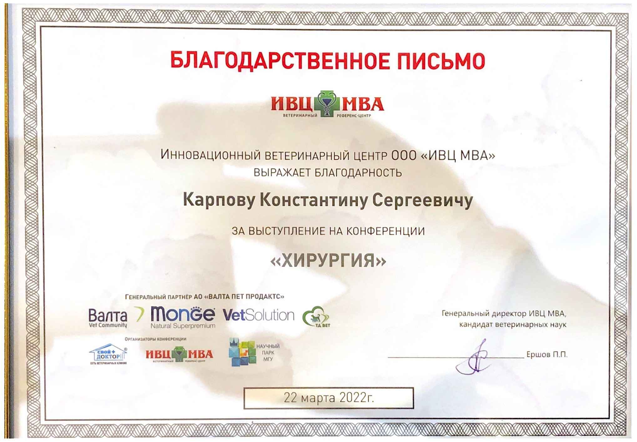 2022 год – лектор на XXV Московской международной ветеринарной конференции (MVC).