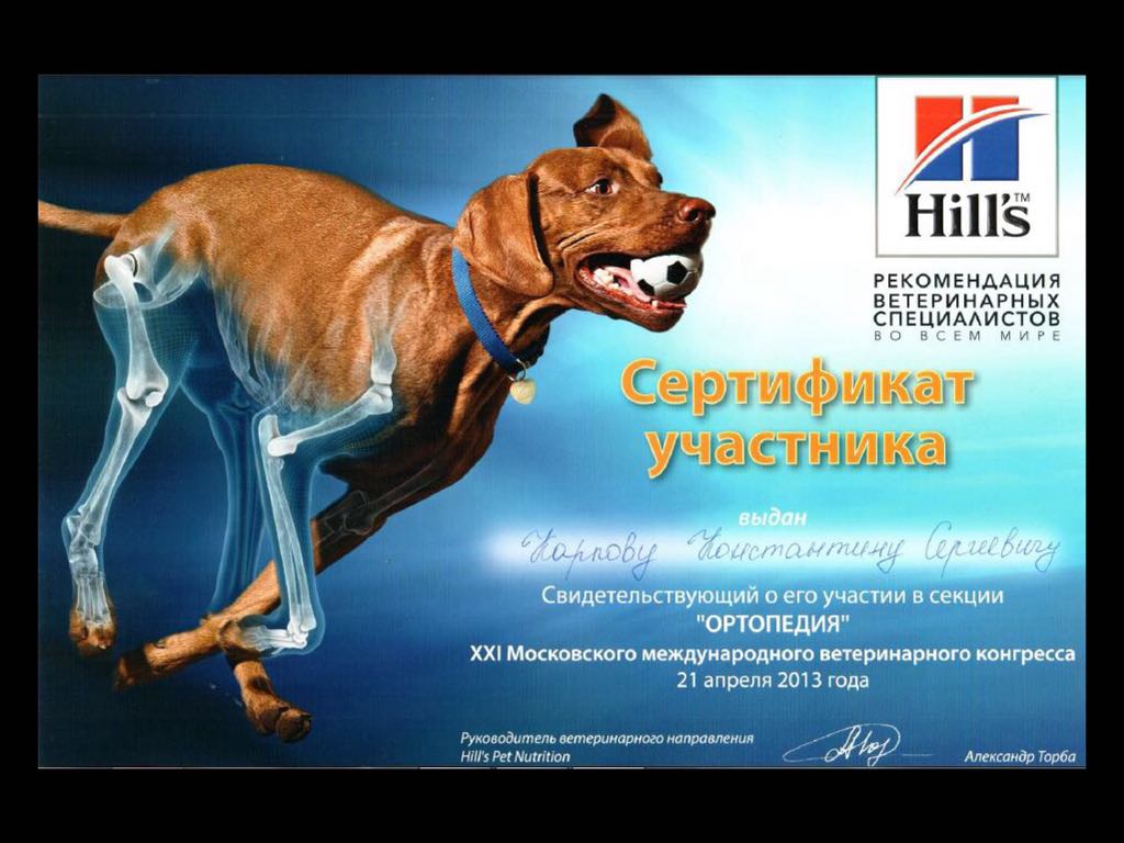2013 год – слушатель ветеринарной конференции по секции «Ортопедия».