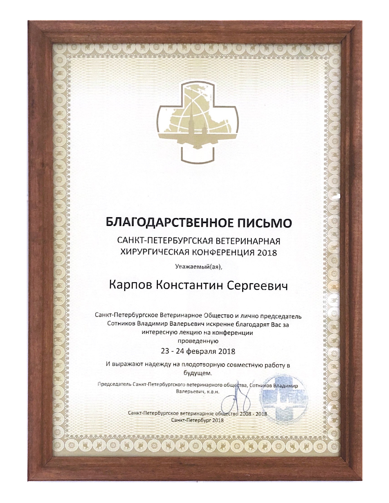 2018 год – участник в качестве докладчика в Санкт-Петербургской ветеринарной конференции по хирургии.