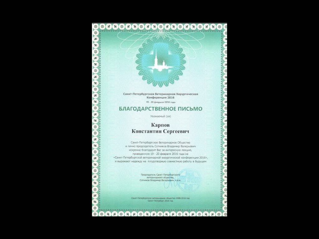 2016 год – участник в качестве докладчика в Санкт-Петербургской ветеринарной конференции по хирургии.