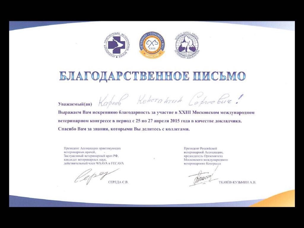 2015 год – участник в качестве докладчика в Московской ветеринарной конференции.