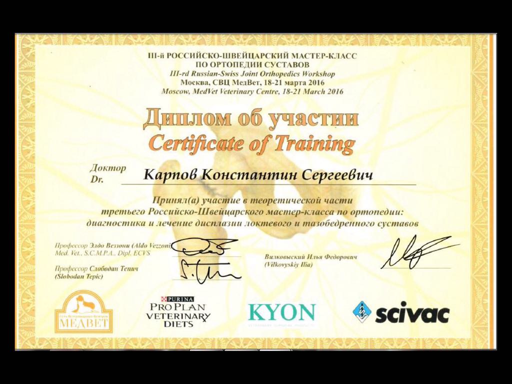 2019 год – прошёл мастер-класс на тему «Минимально инвазивный остеосинтез (БИОС, MIPO), организованный Российским обществом ветеринарной Ортопедии и Травматологии.