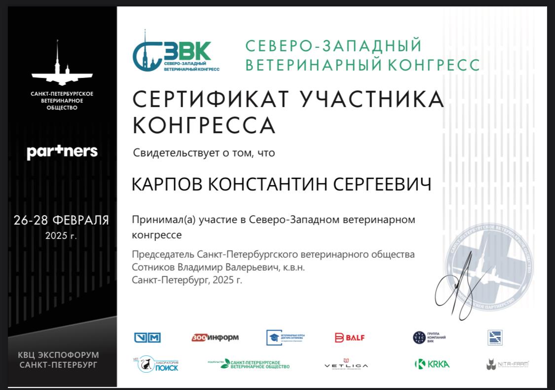 2025 год – принял участие в Северо-Западном ветеринарном конгрессе.