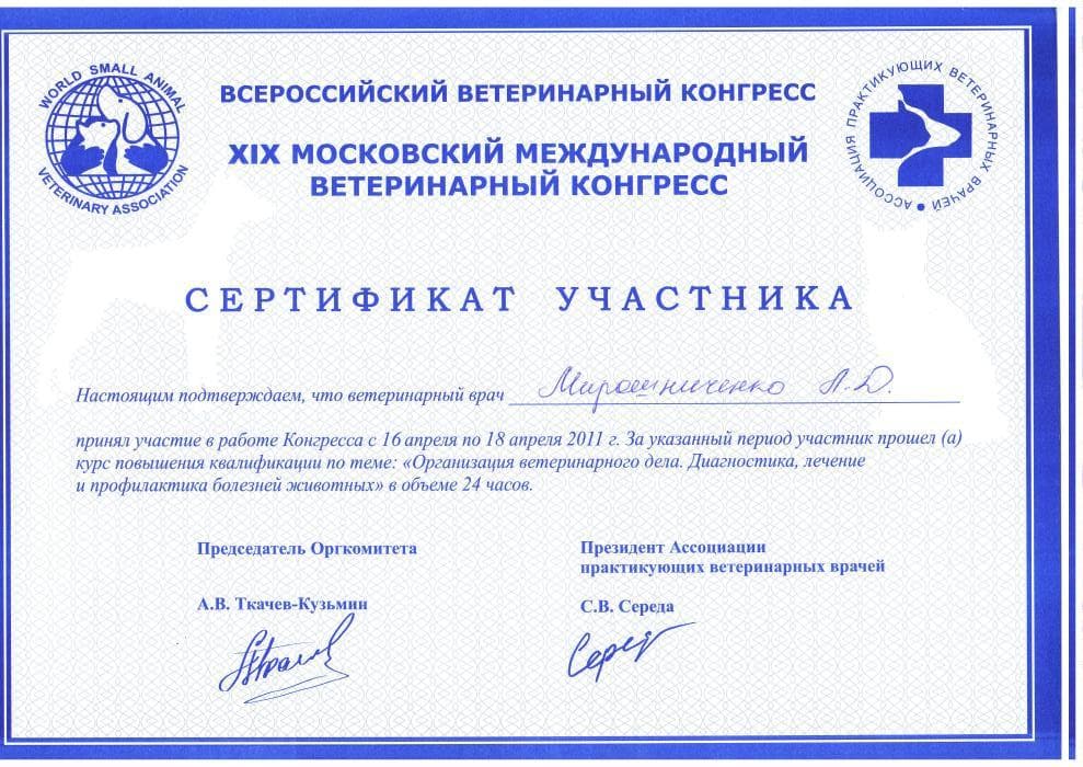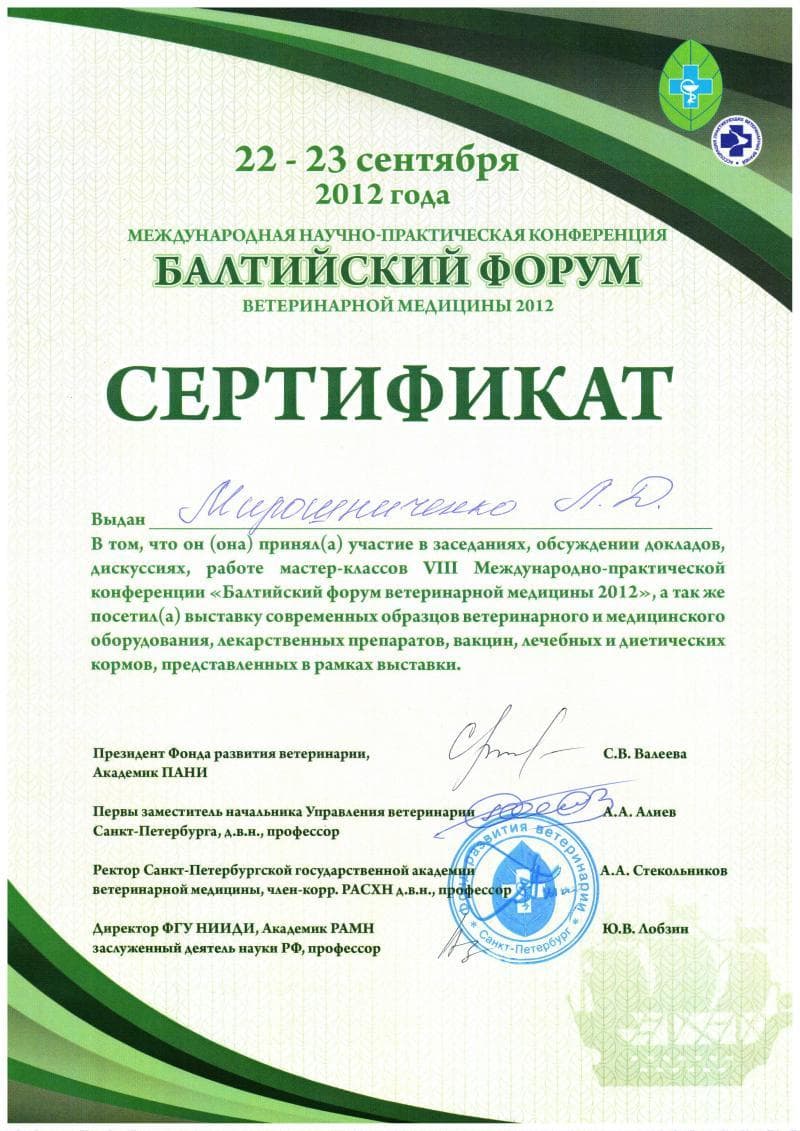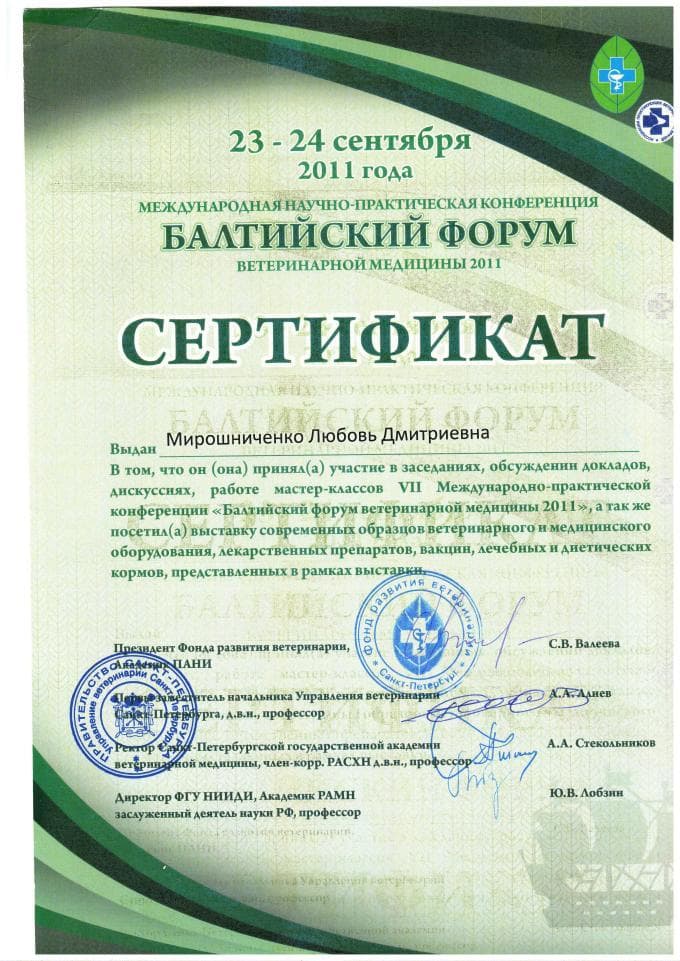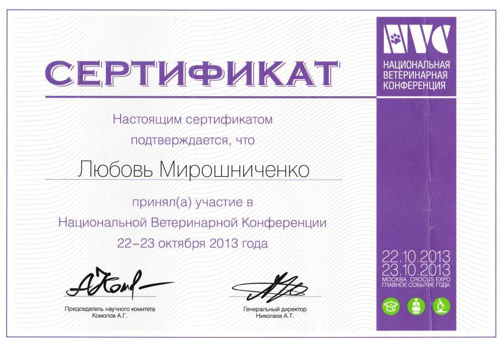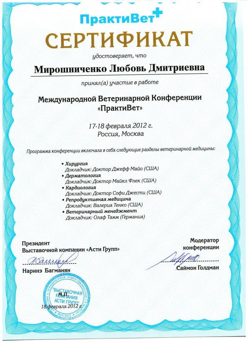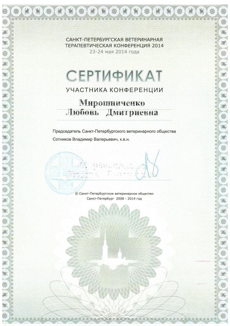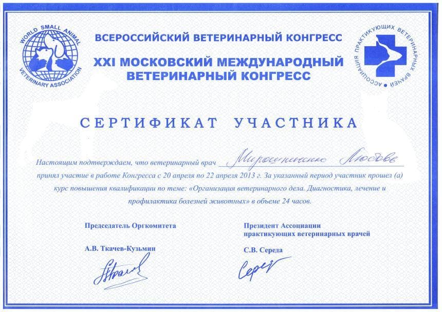 Постоянный участник ветеринарных конференций, входящих в программу постдипломного образования, как в России, так и за рубежом. Не понаслышке знакома с прогрессивной зарубежной ветеринарной литературой, данные которой применяет в повседневной практике, сторонник доказательной медицины.