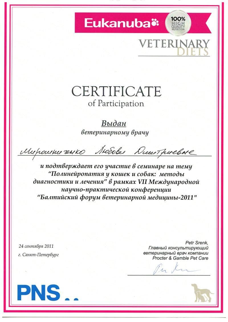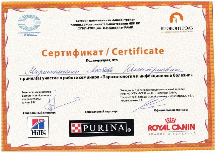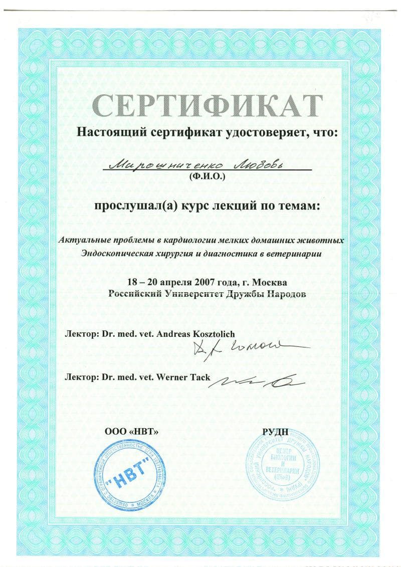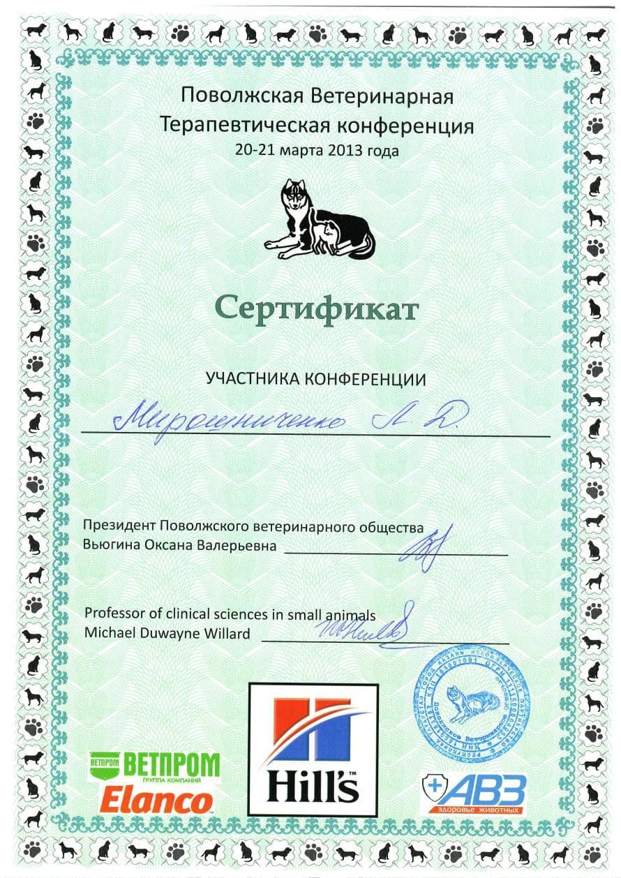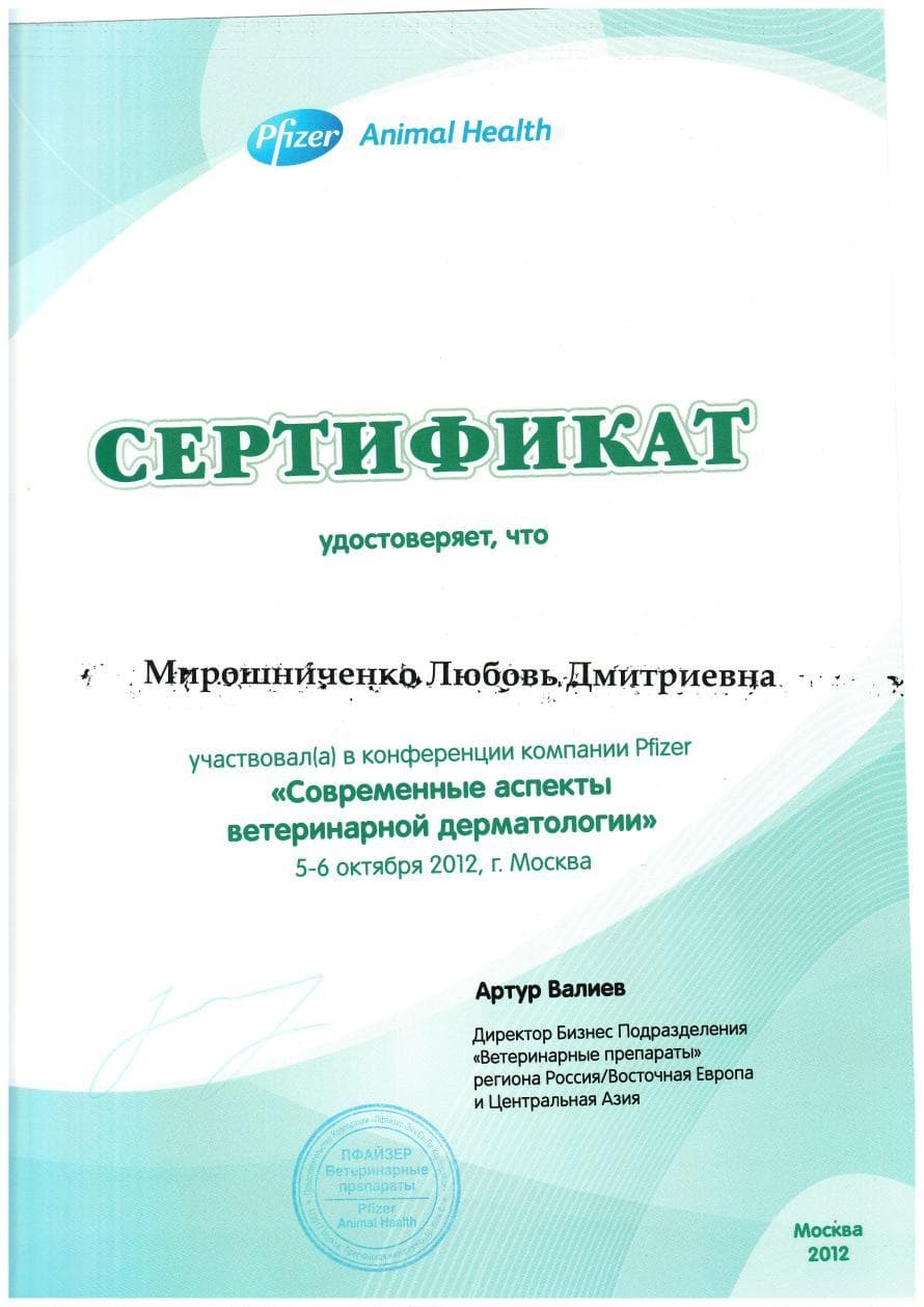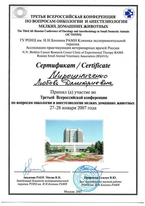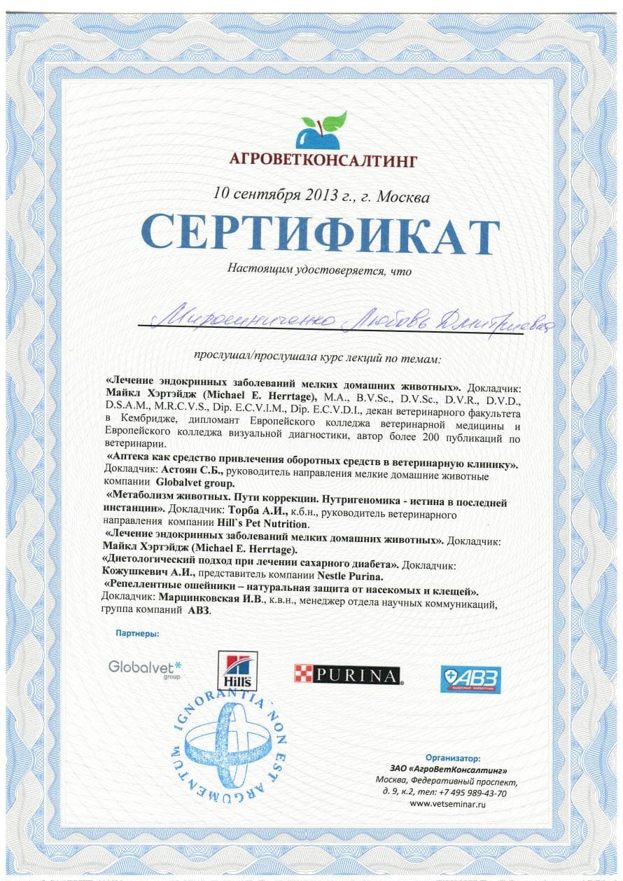 Постоянный участник ветеринарных конференций, входящих в программу постдипломного образования, как в России, так и за рубежом. Не понаслышке знакома с прогрессивной зарубежной ветеринарной литературой, данные которой применяет в повседневной практике, сторонник доказательной медицины.