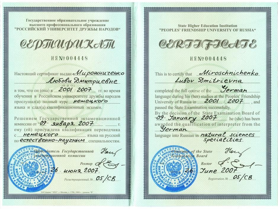 Имеет диплом переводчика-специалиста (немецкий язык).