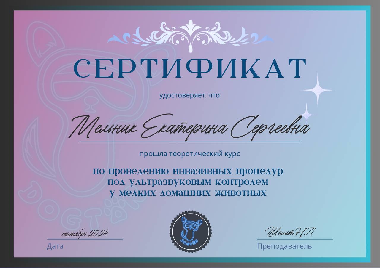 Ежегодно посещает ветеринарные конференции, семинары, онлайн конференции и мастер-классы по болезням домашних животных.