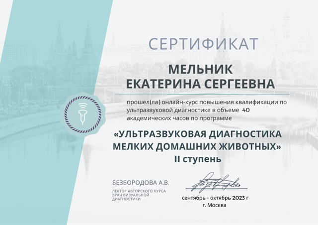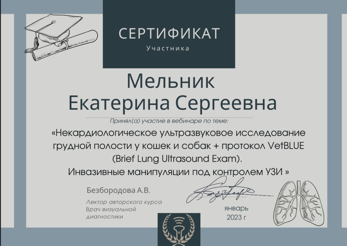 2023 — курс «Некардиологическое исследование грудной полости у кошек и собак. Инвазивные манипуляции под контролем УЗИ», лектор Безбородова А. В.