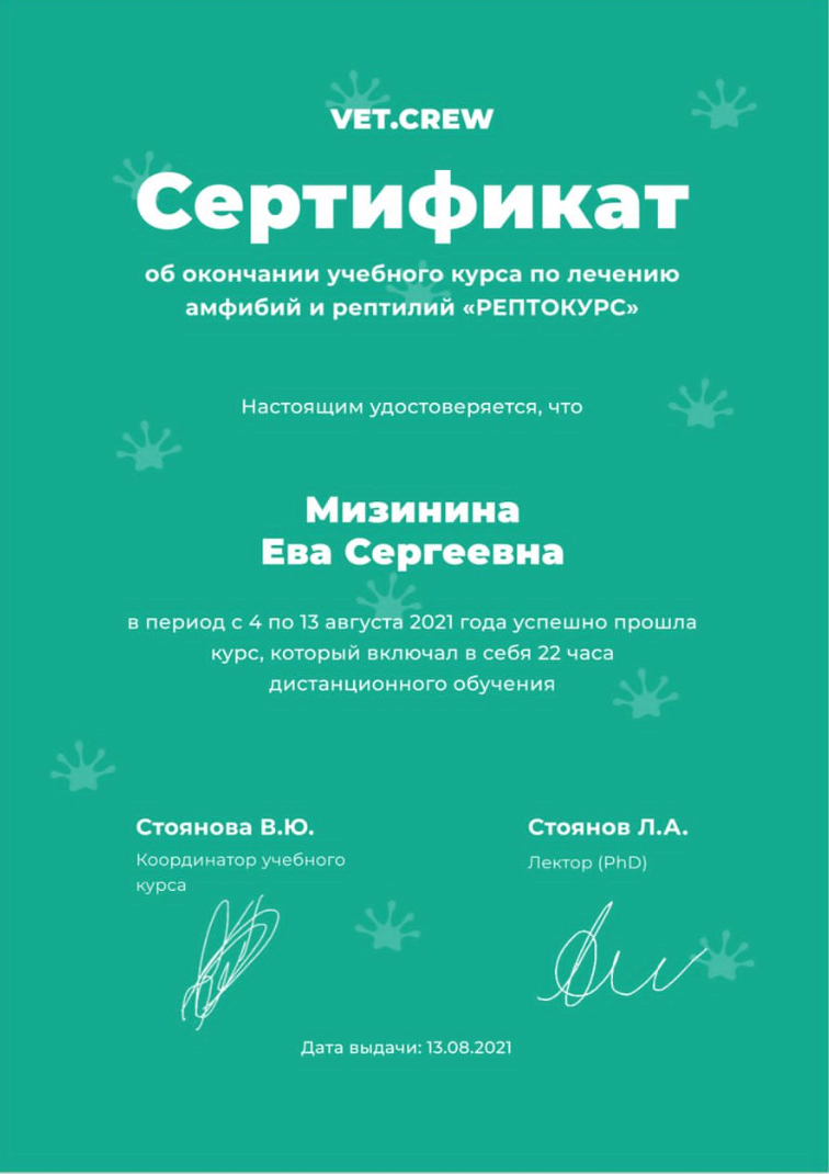 2021 год – прошла обучающий курс по лечению амфибий и рептилий «Рептокурс» от Vet.Crew.